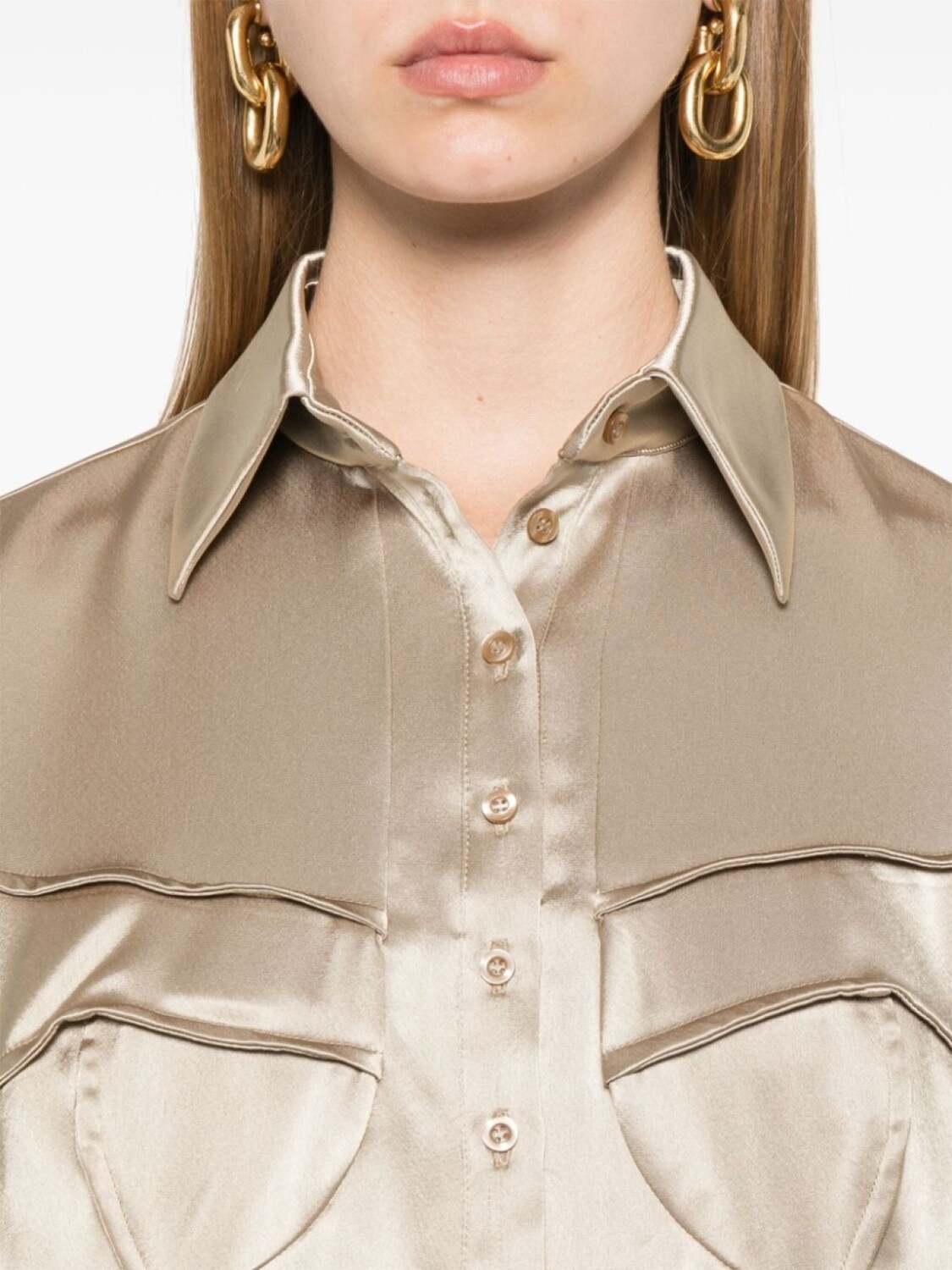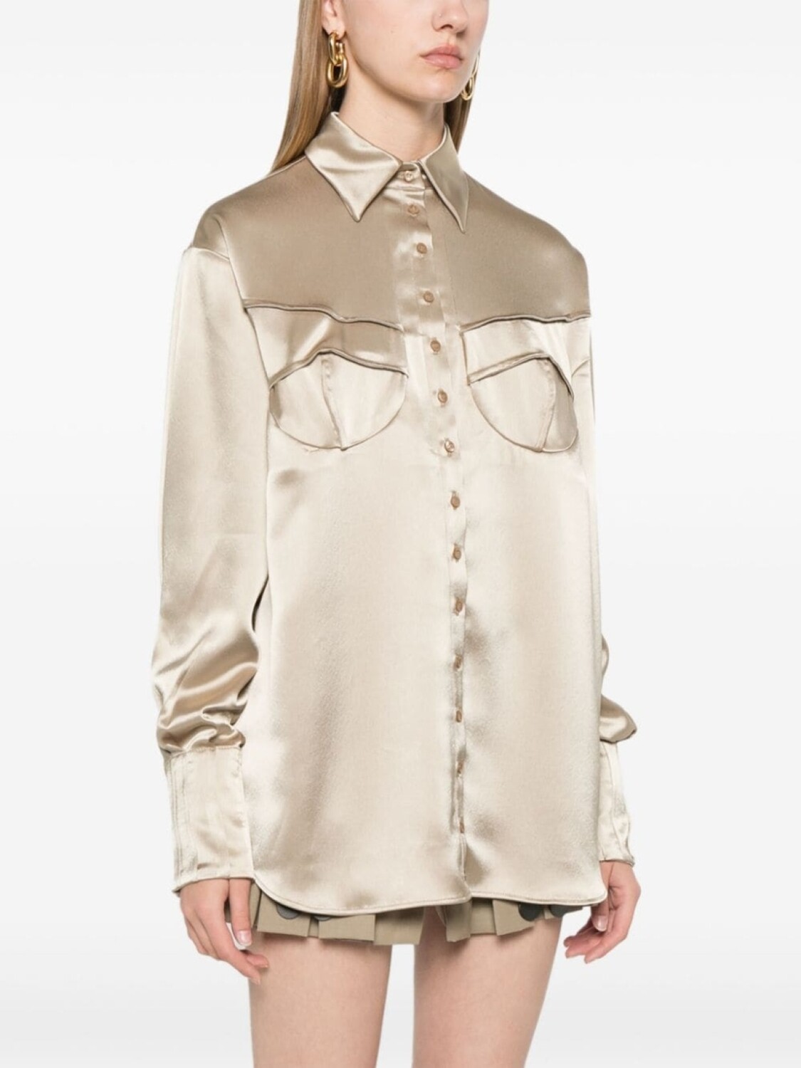Карамельно-коричневая атласная отделка, застежка на пуговицы спереди, классический воротник, длинные рукава, манжеты на пуговицах, отделка кантом, формованные чашки, складки, изогнутый подол