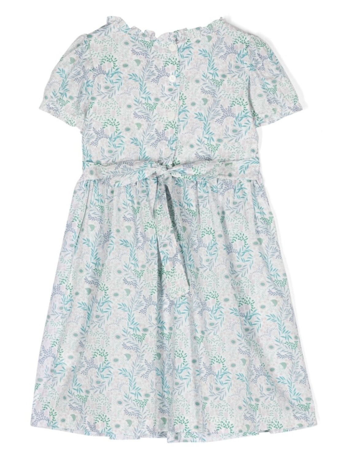 Белый/разноцветный, смесовый хлопок, сплошной цветочный принт, присборенный воротник, застежка на пуговицы сзади, застежка на завязке сзади, короткие рукава, манжеты с оборками, сборка на талии, расклешенная юбка, прямой подол