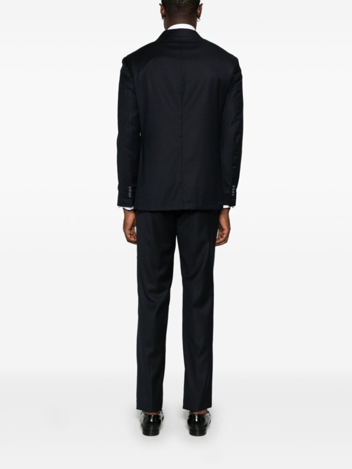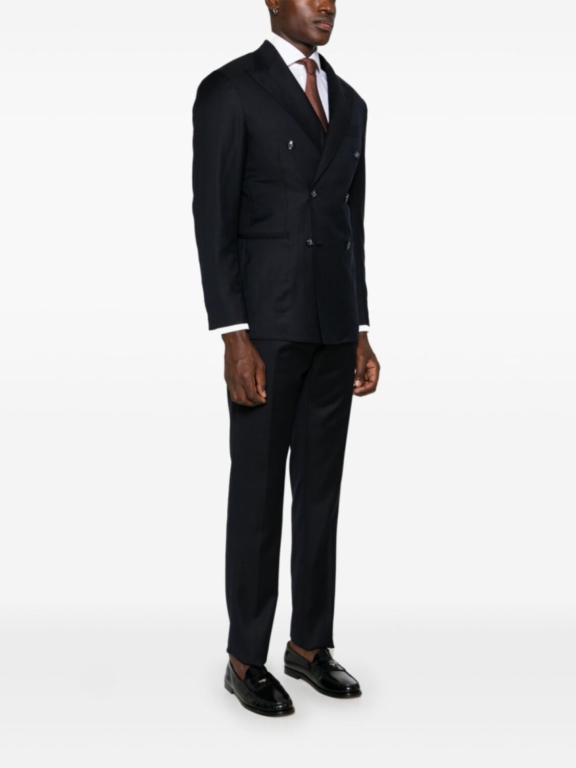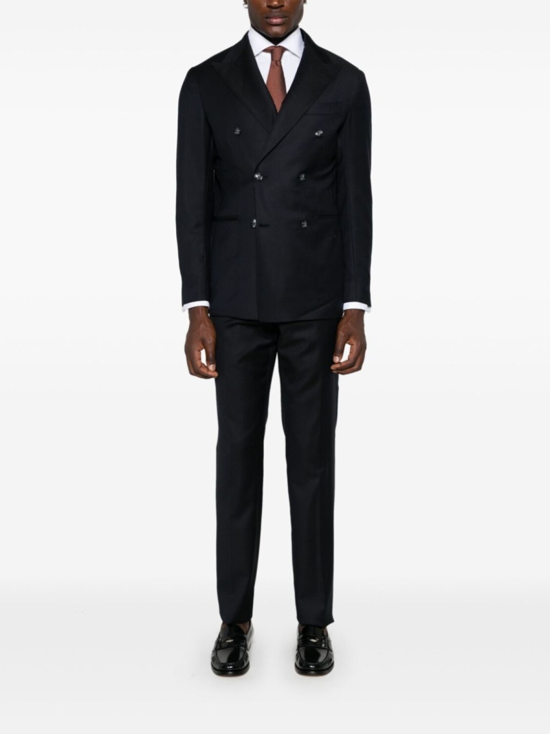 Подробнее о товаре: • темно-синий • вирджинская шерсть • двубортная застежка на пуговицы • заостренные лацканы • длинные рукава • манжеты с декоративными пуговицами • прорезной карман на груди • защипы • два прорезных кармана спереди • две боковые шлицы сзади • три внутренних прорезных кармана • частичная подкладка • застежка на молнии и пуговице спереди • низкая посадка • петли для ремня • стрелки • два диагональных кармана по бокам • защипы • два прорезных кармана на пуговицах сзади • строгий крой • прямой крой