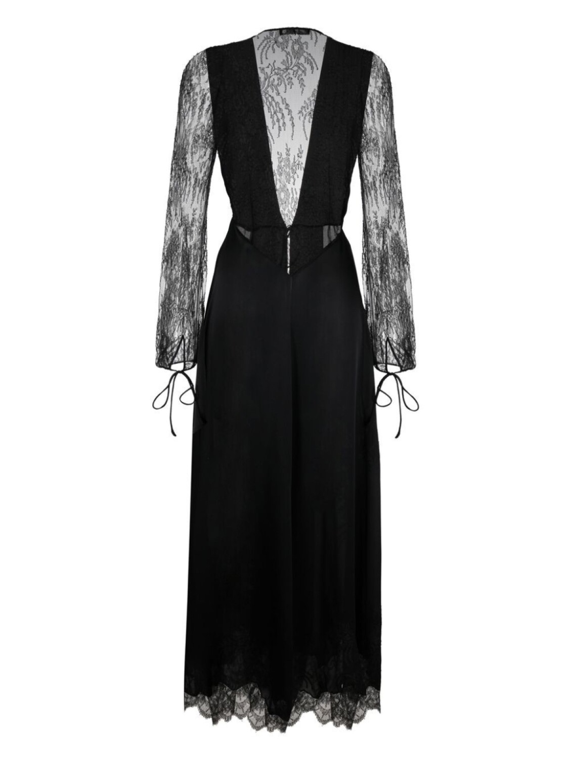 Черный, шелк, сатиновая фактура, V-образный вырез, длинные прозрачные рукава, аппликация из кружева с цветочным узором, кружево шантильи, объемные рукава, манжеты с завязками, длина макси, модель на запах, приталенный силуэт, кулиска на талии, кружевная отделка и закругленный подол.