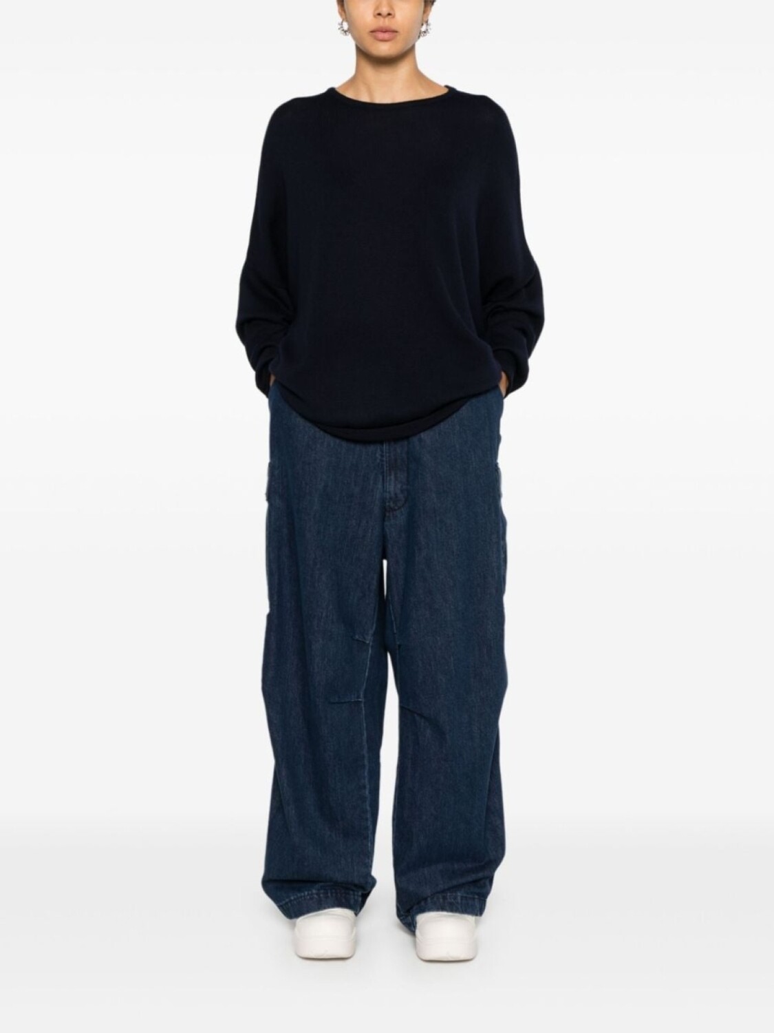 Темно-синий хлопковый деним, эластичный пояс, два диагональных кармана по бокам, два боковых кармана-карго, накладной карман сзади, вышитый мотив, широкие штанины, потайная застежка на пуговицы. При покупке этой вещи унисекс имейте в виду, что она классифицируется по стандартным мужским размерам.