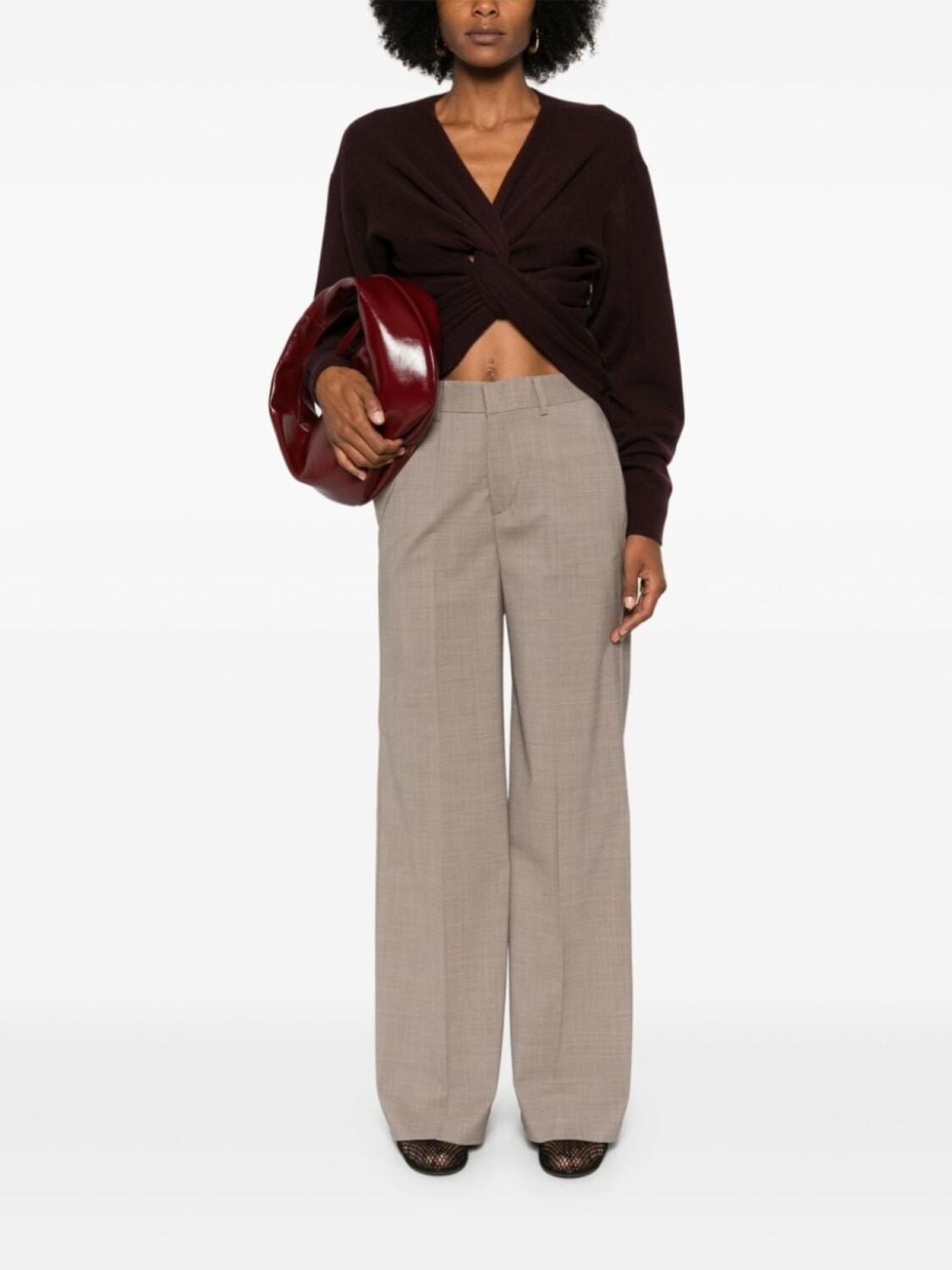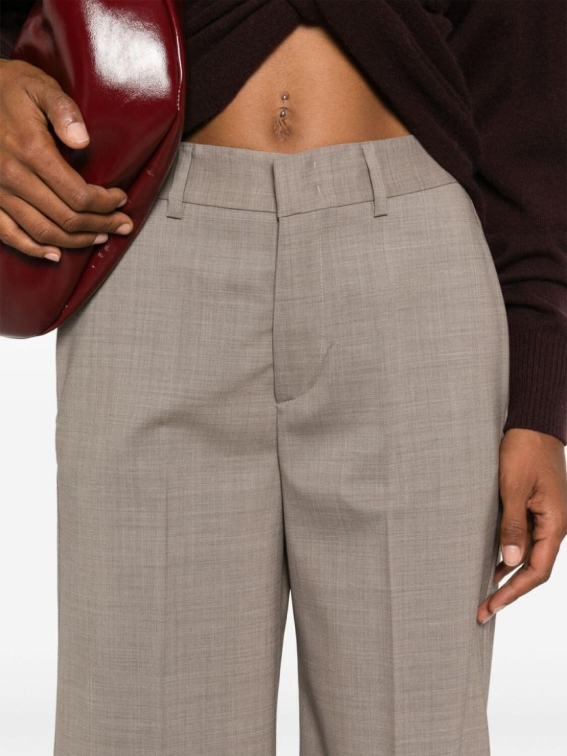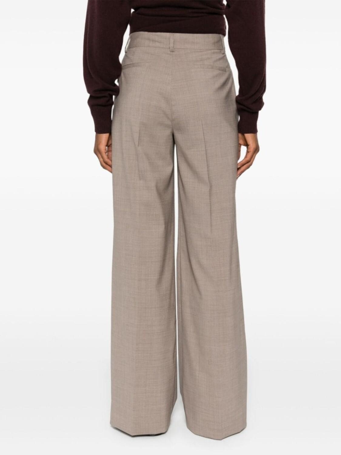 Бежевый, смесовая вирджинская шерсть, плетение интерлок, эффект меланж, потайная застежка на пуговицы, крючок и молнию спереди, средняя посадка, петли для ремня, стрелки, два прорезных кармана по бокам, защипы, два кармана с листочкой сзади, прямой крой