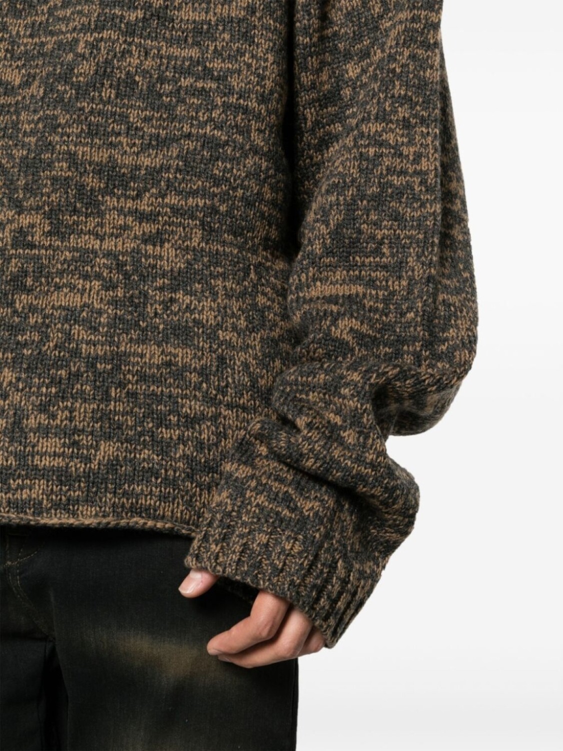 Песочно-коричневый, кофейный, шерсть, крупная вязка, вязка в технике интарсия, вязаные края в рубчик, эффект меланж, круглый вырез, приспущенные плечи, длинные рукава и прямой подол.