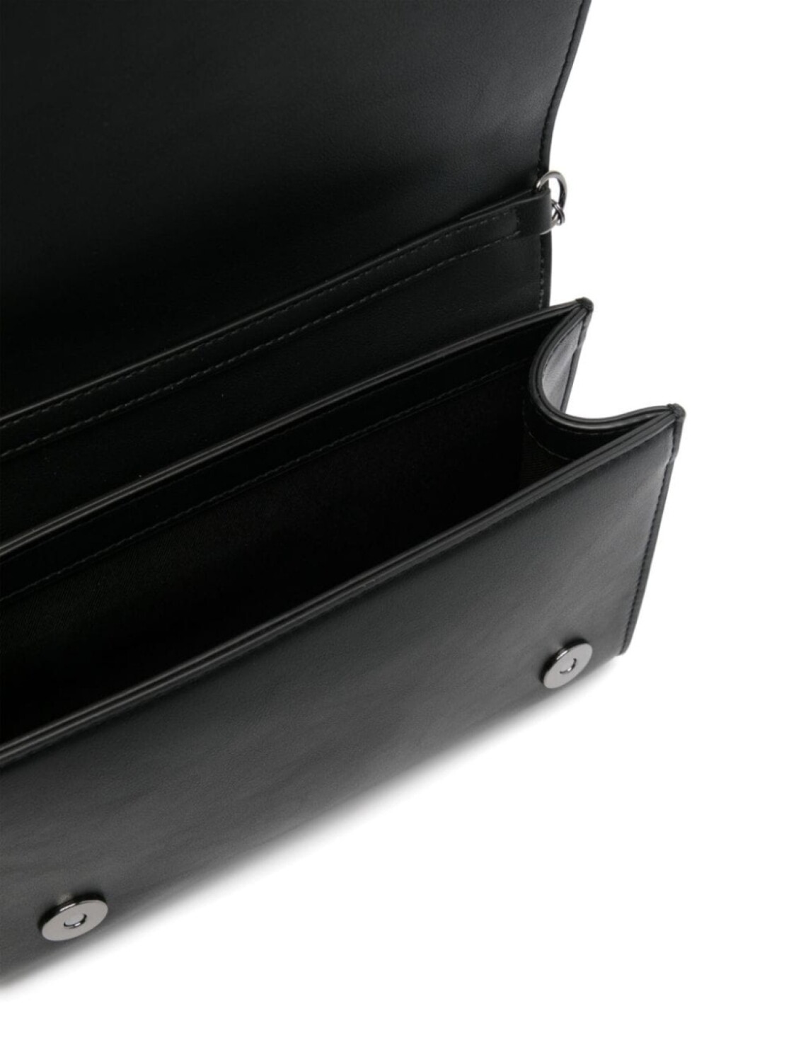 Черная искусственная кожа тонового дизайна, люверсы, логотип, надпись, откидной клапан сверху с магнитной застежкой, цепочный плечевой ремень, основное отделение, внутренние слоты для карт