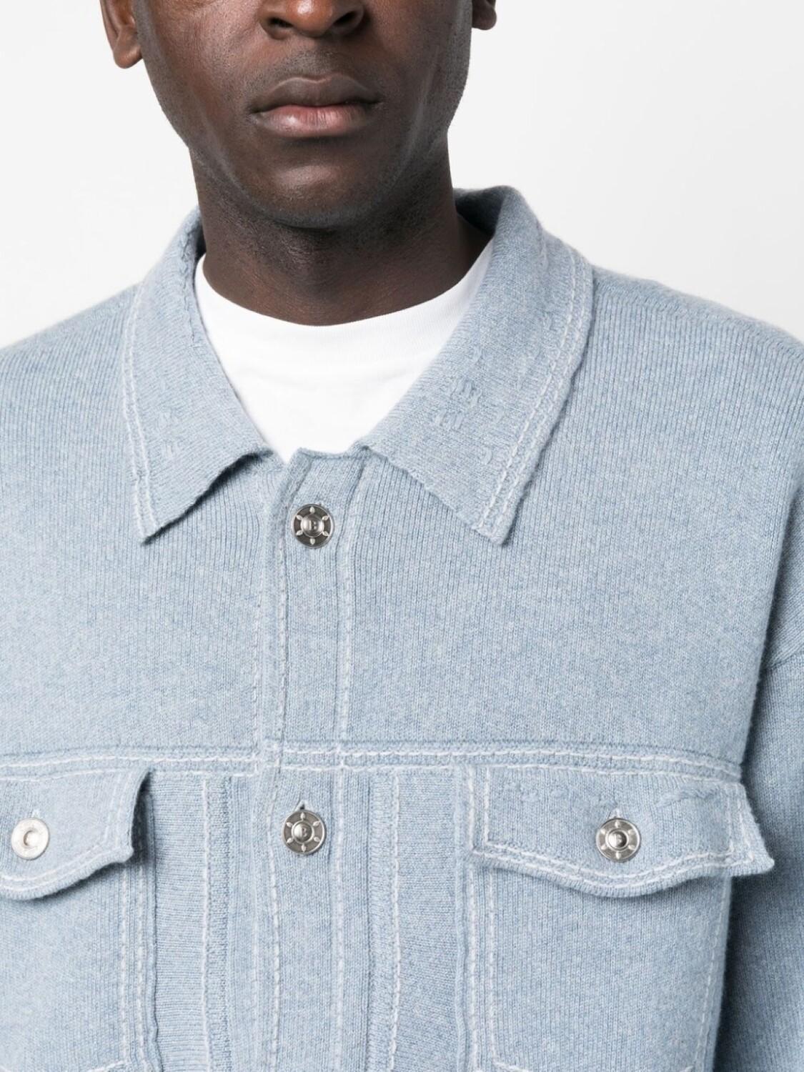 Нежно-голубой, смесь хлопка и кашемира, деним, классический воротник, застежка на пуговицах спереди, длинные рукава, два нагрудных кармана с клапанами и прямой подол.