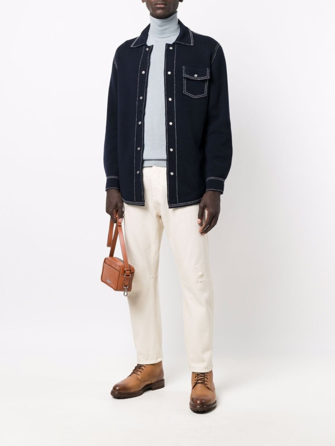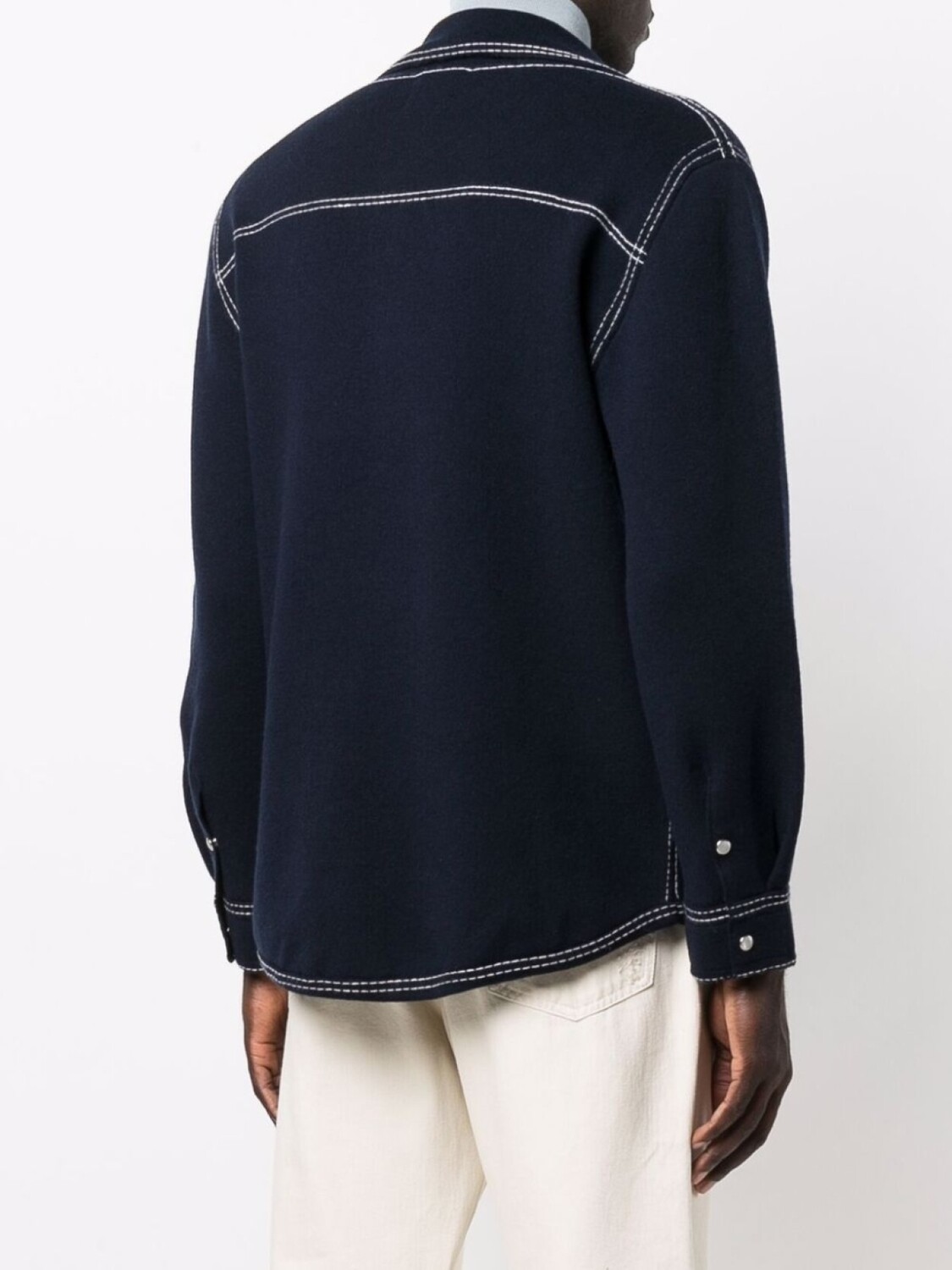 Контрастная строчка, передний карман с клапаном, классический воротник, длинные рукава и манжеты на пуговицах.