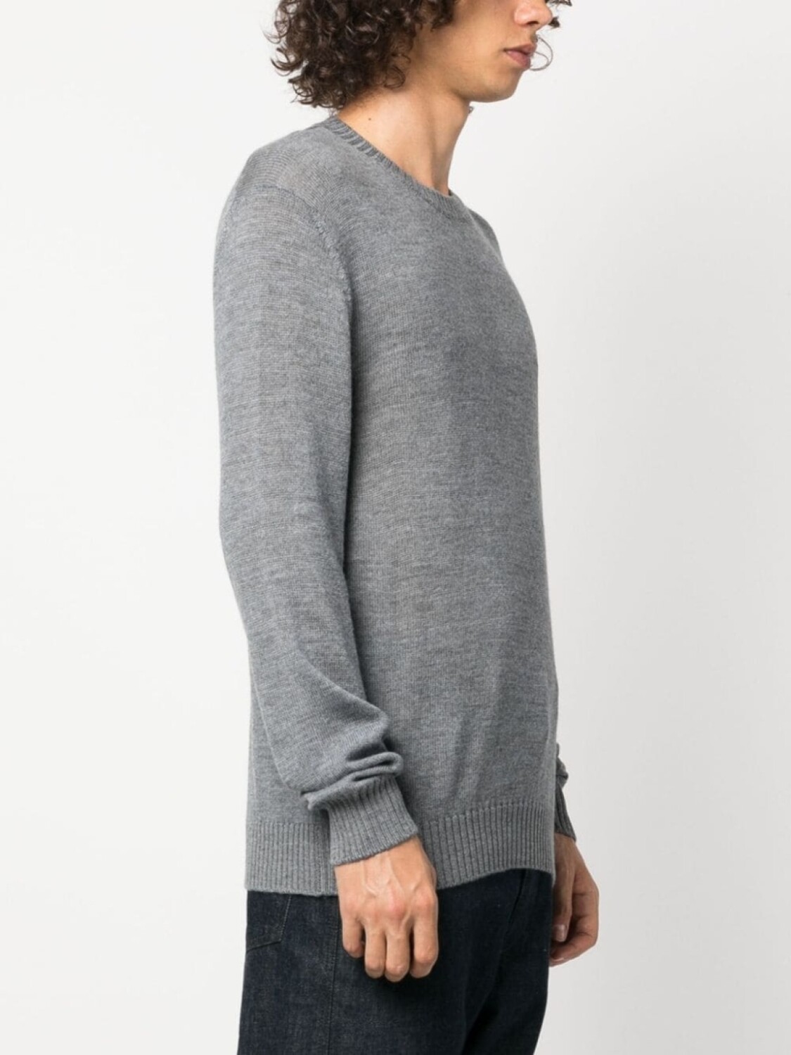 Темно-серый, тонкая вязка, круглый вырез, длинные рукава и подол в рубчик.