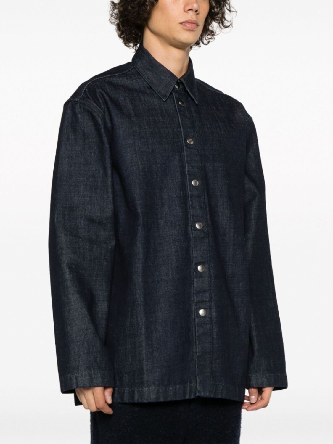 Темно-синий, хлопок, деним, темный оттенок денима, застежка на кнопках спереди, длинные рукава, классический воротник и прямой подол.