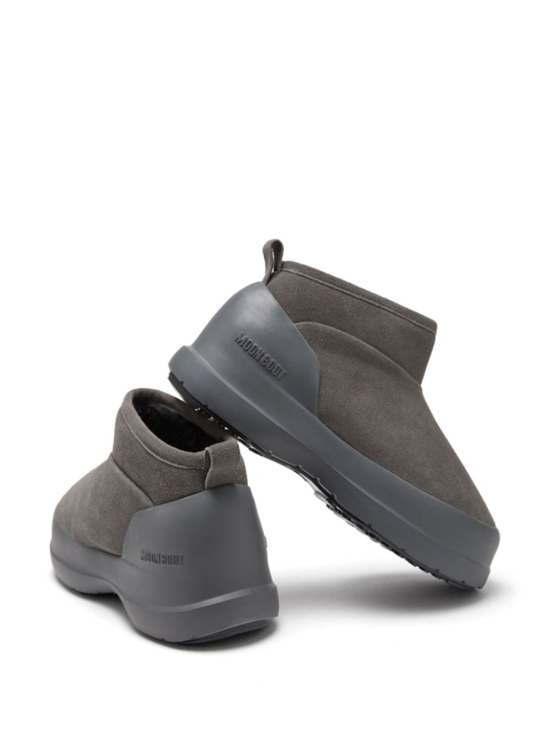 Антрацитово-серый, замша из телячьей кожи, тисненый логотип сбоку, петля для подтягивания сзади, закругленный носок, без застежки, стелька с логотипом, массивная резиновая подошва