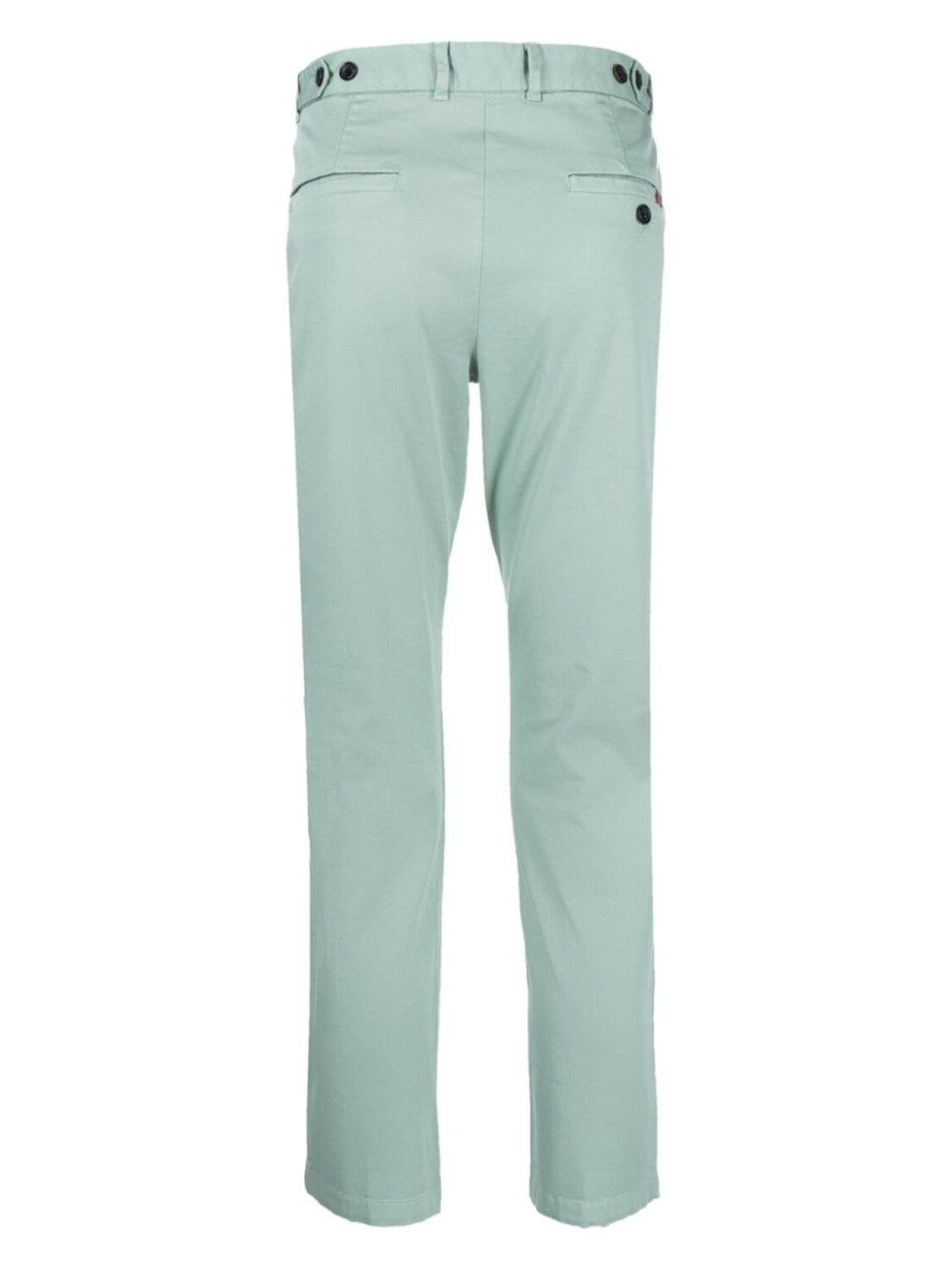 Мятно-зеленый, смесовый хлопок, матовое покрытие, петли для ремня, потайная застежка на молнии и пуговицах, два вшитых кармана по бокам, два кармана с листочкой сзади и узкий крой.
