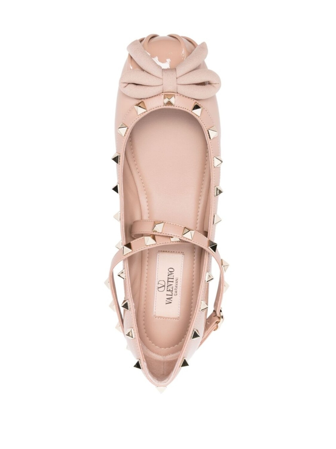 Розовый, заклепки Rockstud, закругленный носок, плоская подошва и ремешок на щиколотке с пряжкой.