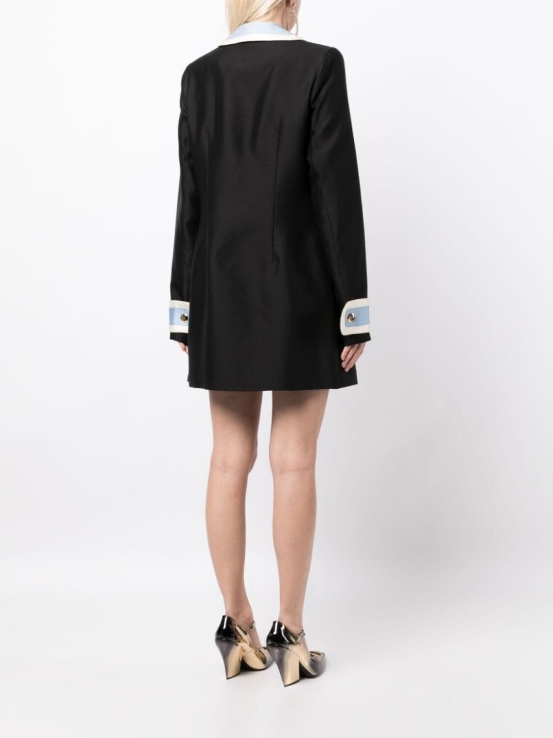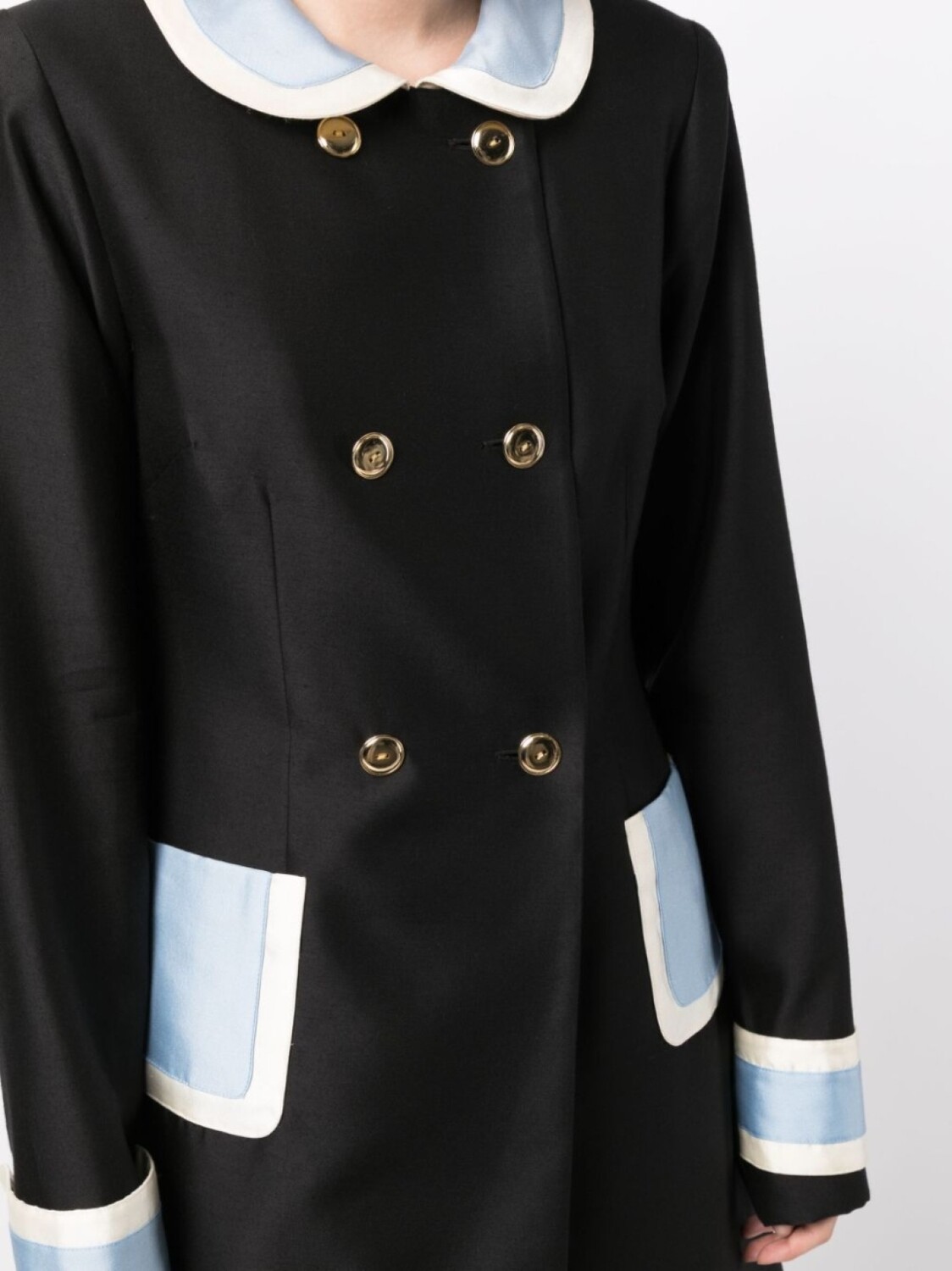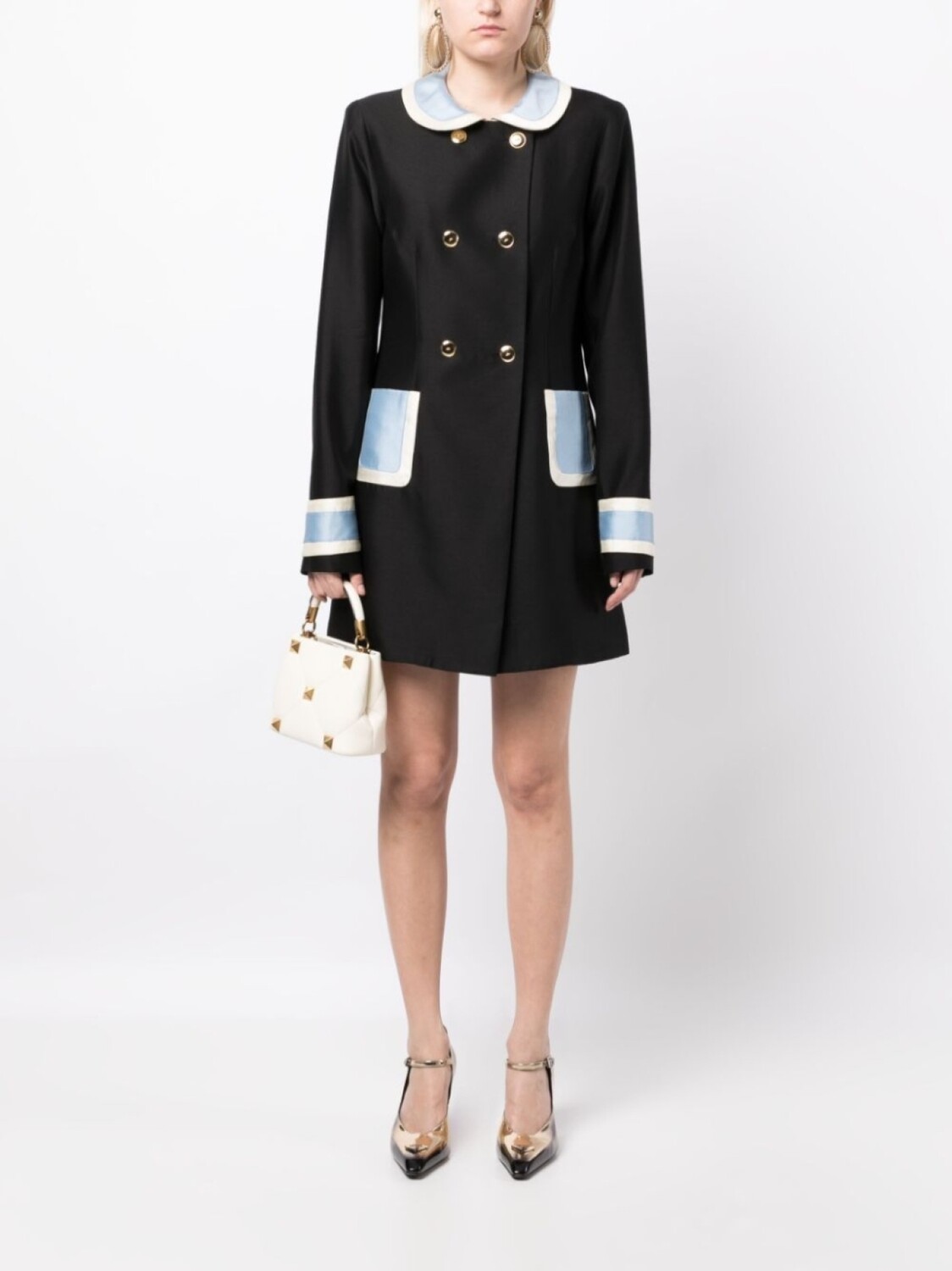 Черный, молочно-белый, голубой, смесь шерсти и шелка, стиль колор-блок, золотистые пуговицы, швы, закругленный воротник, двубортная застежка на кнопки, длинные рукава, два накладных кармана по бокам, длина до бедер и цельная подкладка.