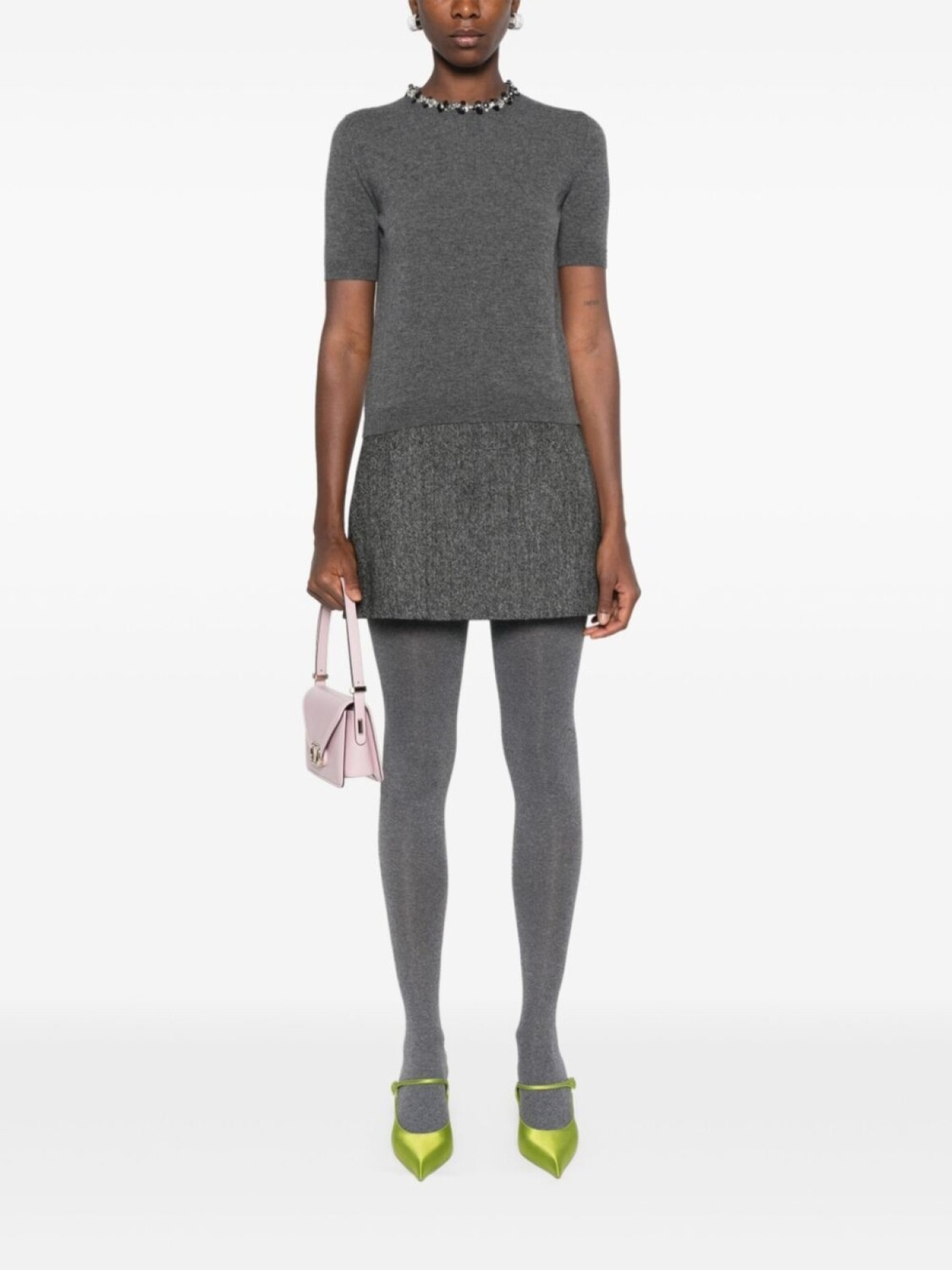 Коллекция Valentino Ready To Wear, темно-серый, чистая шерсть, вязаный дизайн, круглый вырез, украшение из поделочных камней, украшение из пайеток, короткие рукава, подол и манжеты в рубчик, потайная застежка на молнии сзади