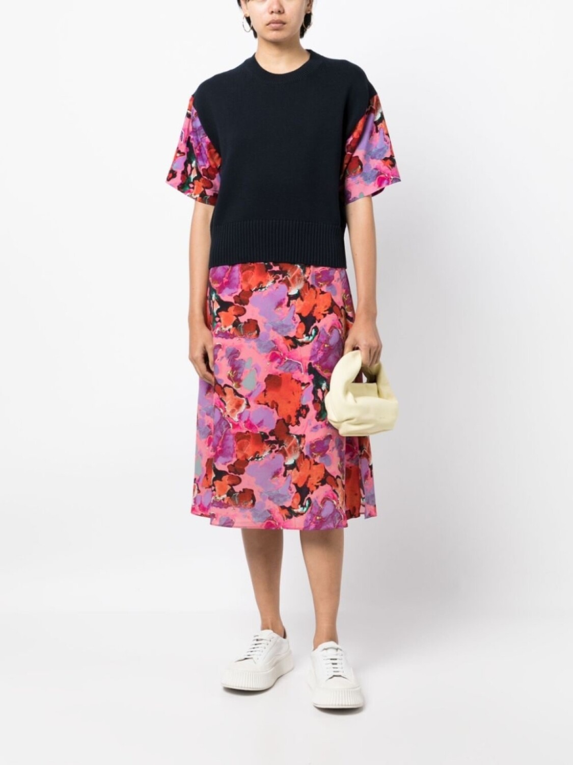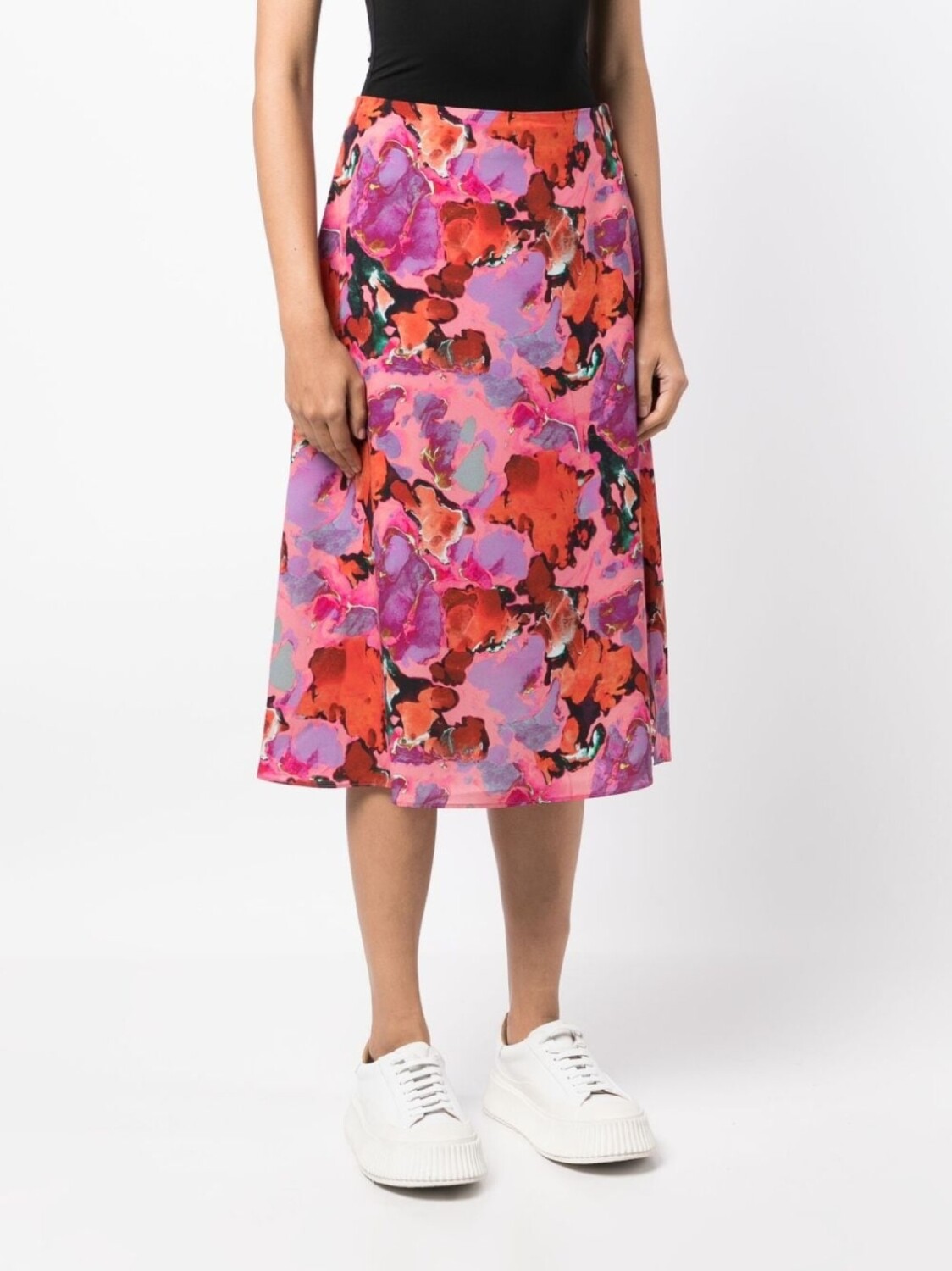 Разноцветный, сплошной графичный принт, юбка А-образного силуэта, средняя посадка, длина миди и прямой подол.