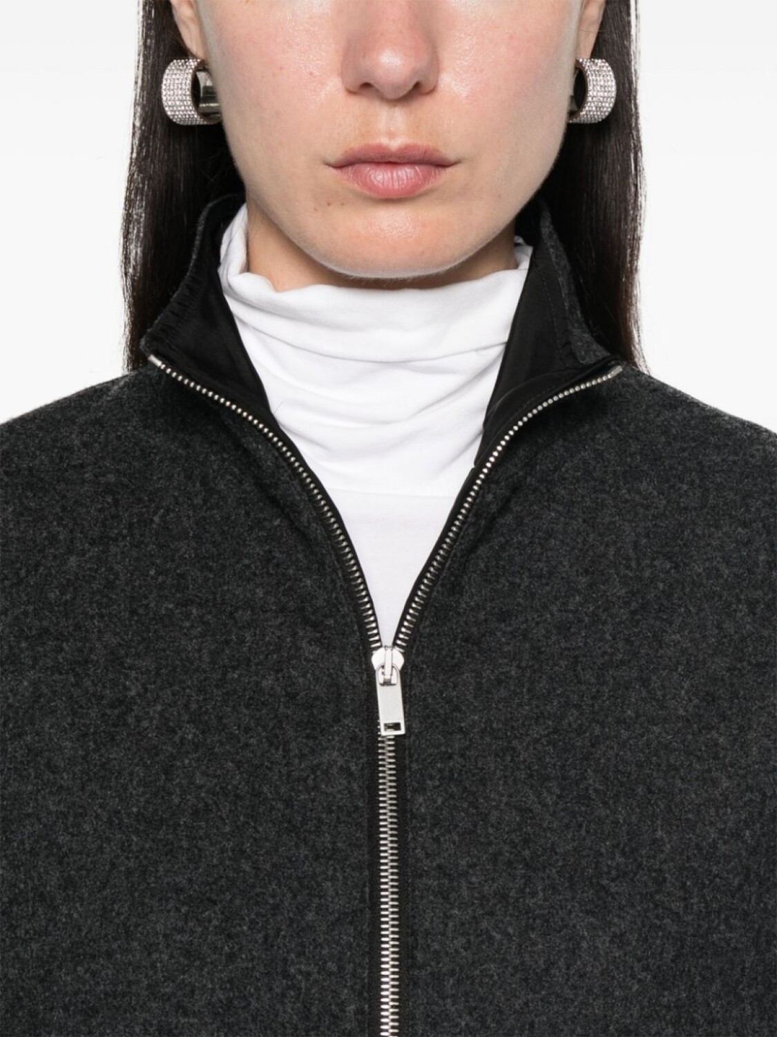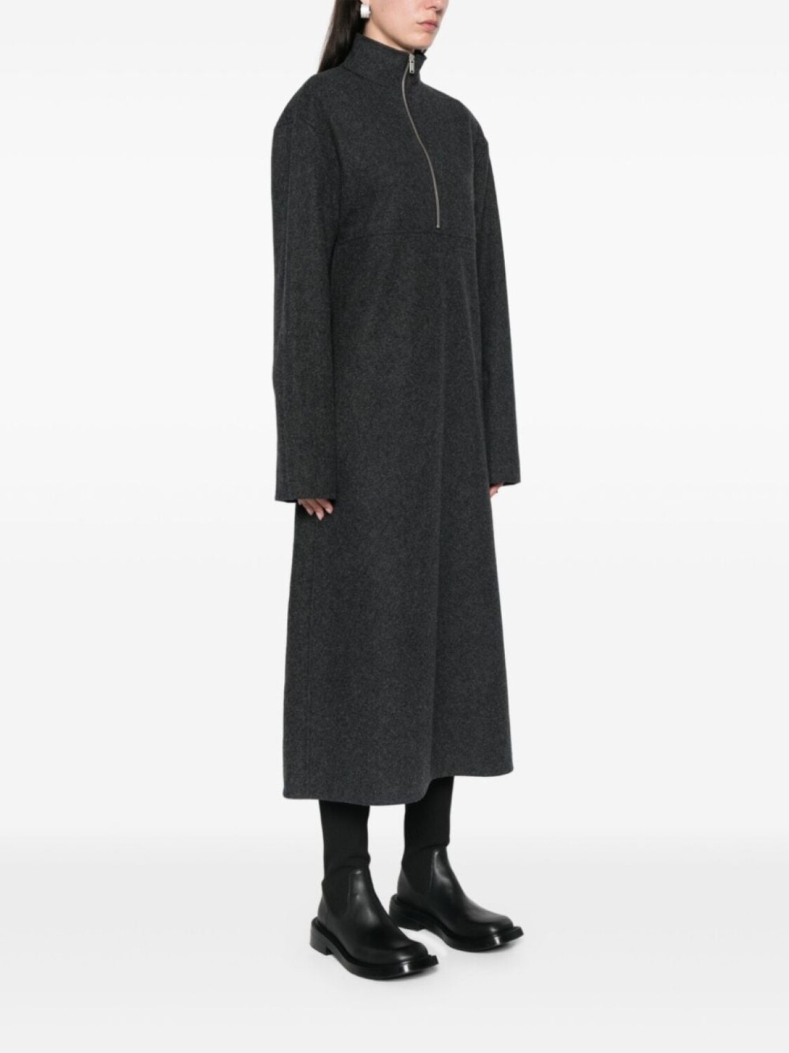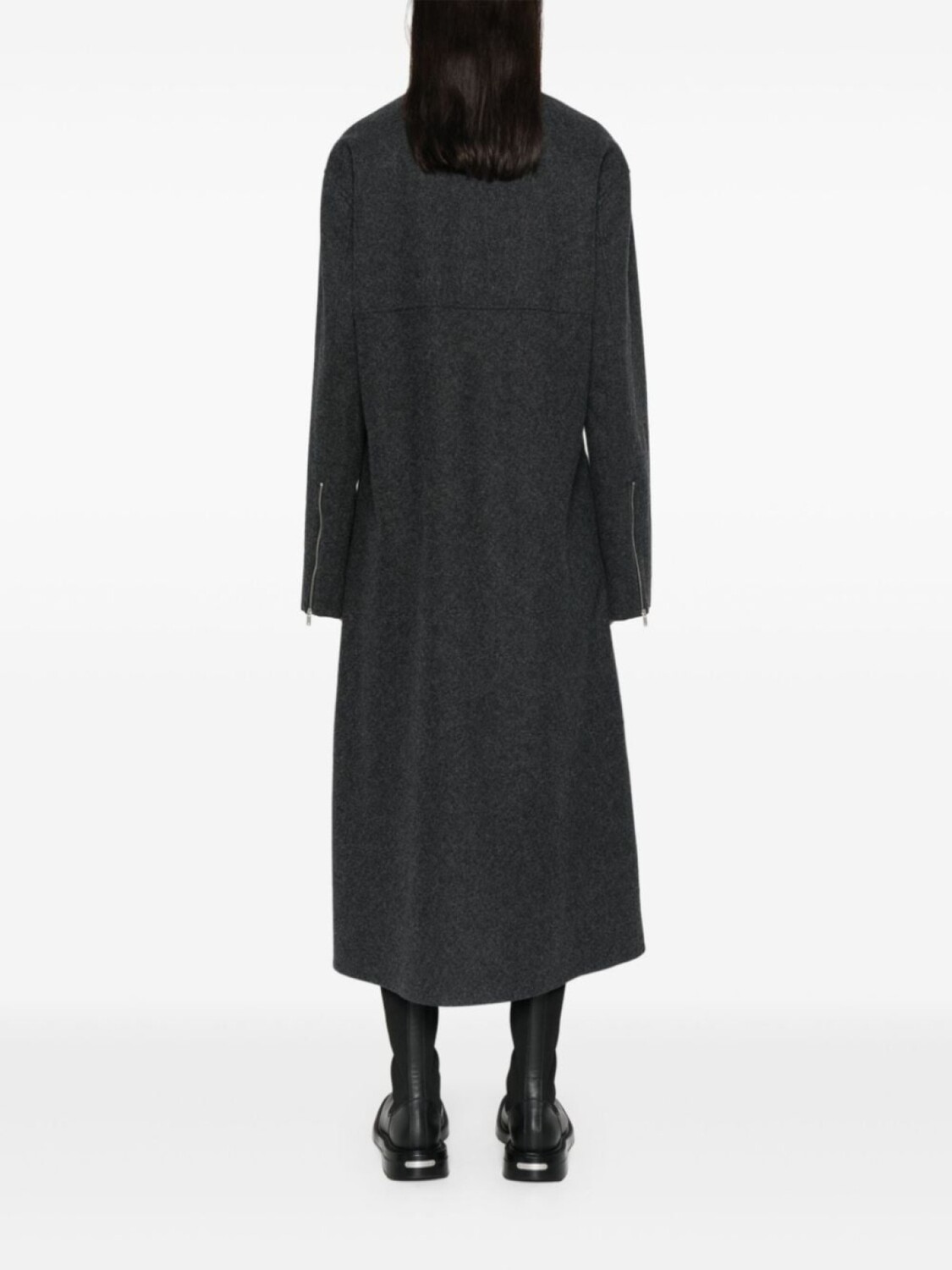 Темно-серый, чистая шерсть, короткая застежка на молнии спереди, высокий воротник, длинные рукава, молнии на манжетах, ампирный силуэт, А-образный силуэт, боковой разрез, прямой подол, средней длины