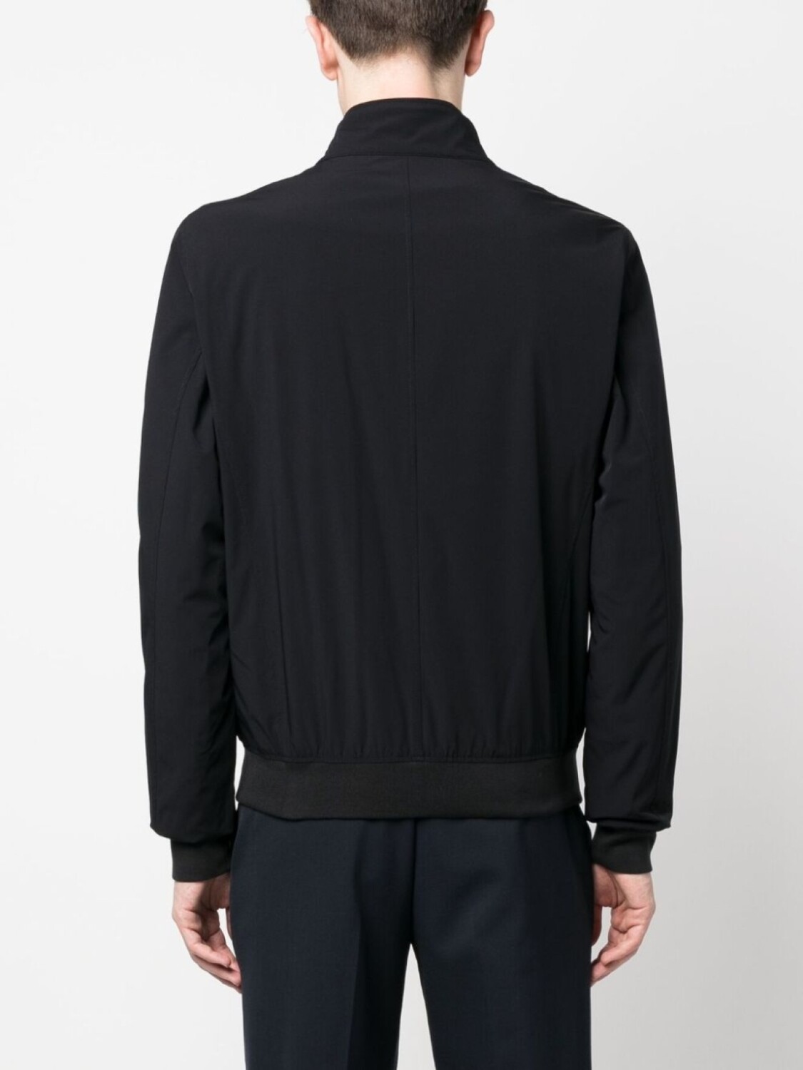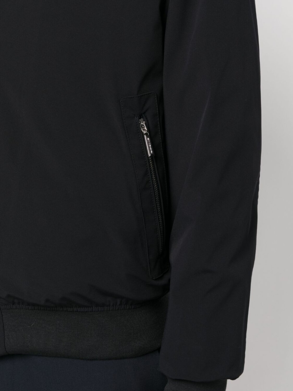 Темно-синий, серебристая фурнитура с выгравированным логотипом, воротник-стойка, застежка на кнопки и молнию спереди, два кармана на молнии и длинные рукава.