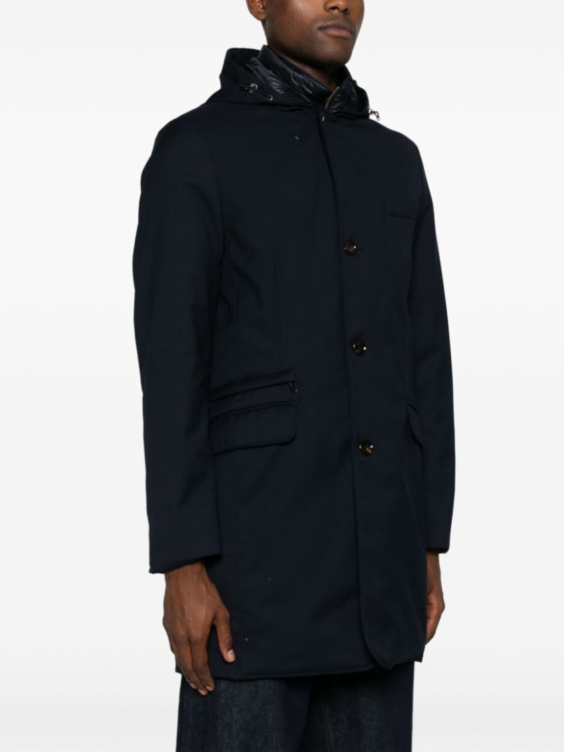 Темно-синий, на пуху, дутый материал, многослойный эффект, съемные вставки, затягивающийся на шнурок капюшон, длинные рукава, прорезной карман на груди, карман на молнии сбоку, два передних кармана с клапанами, центральная шлица на пуговицах сзади, прямой подол, застежка на молнии и пуговице спереди