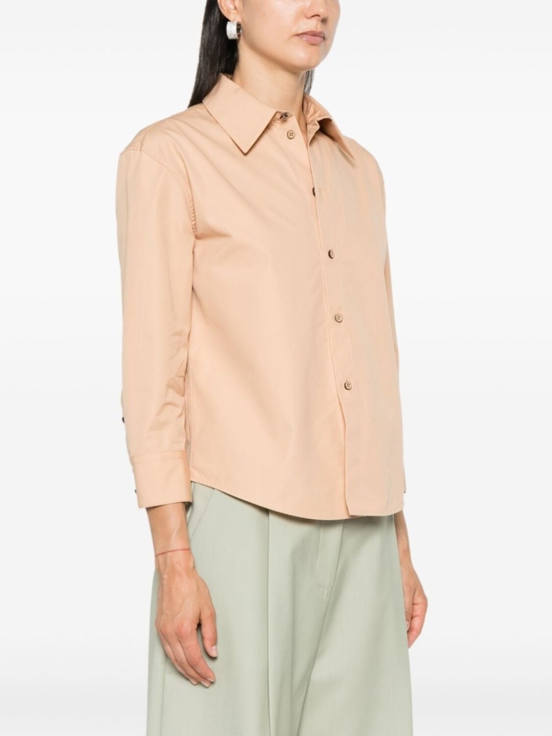 Светло-коричневый, хлопок, плоский заостренный воротник, длинные рукава, манжеты на пуговицах, закругленный подол, застежка на пуговицах спереди