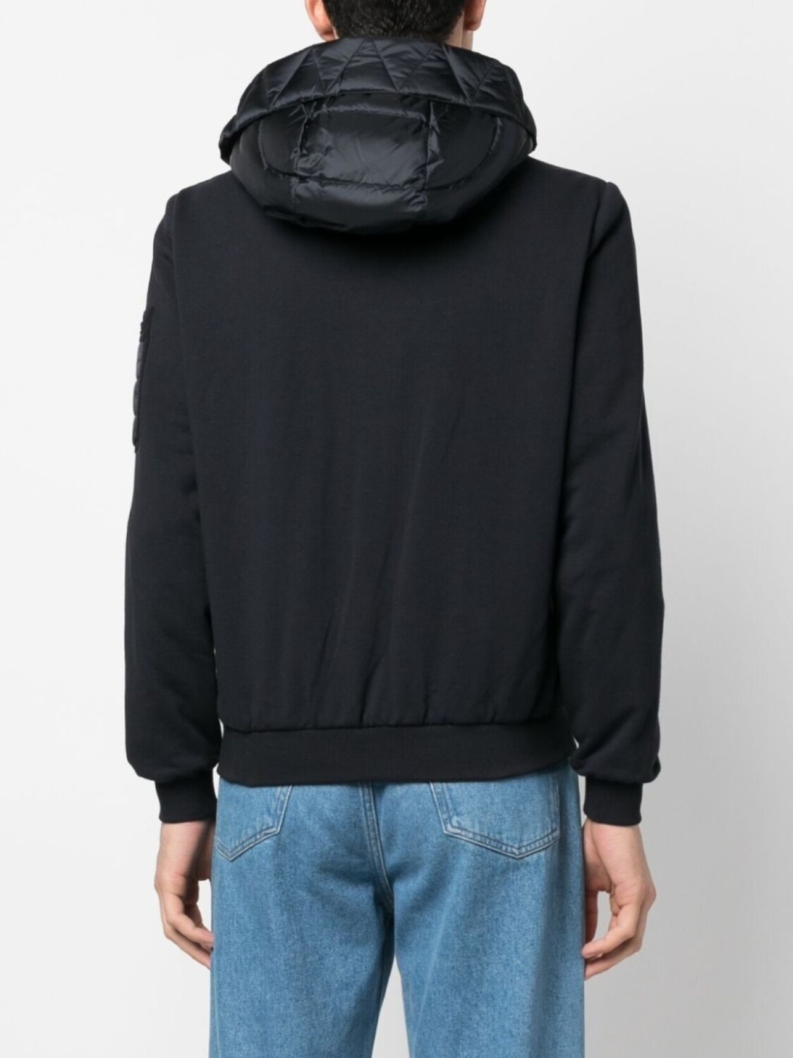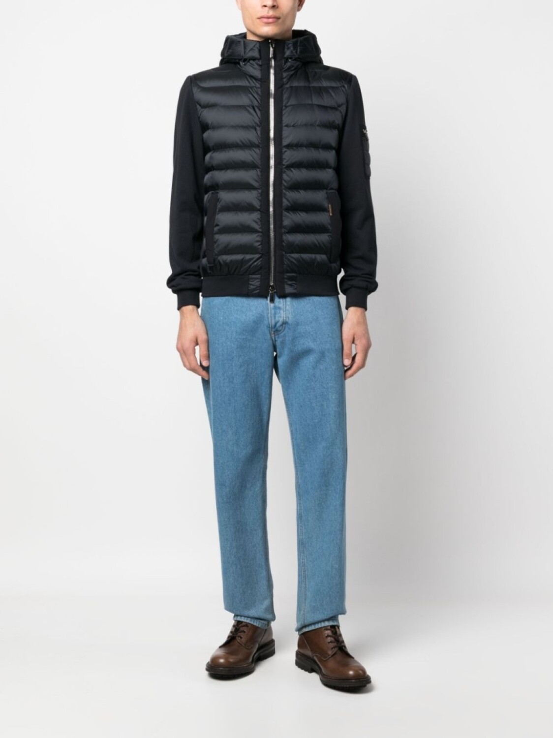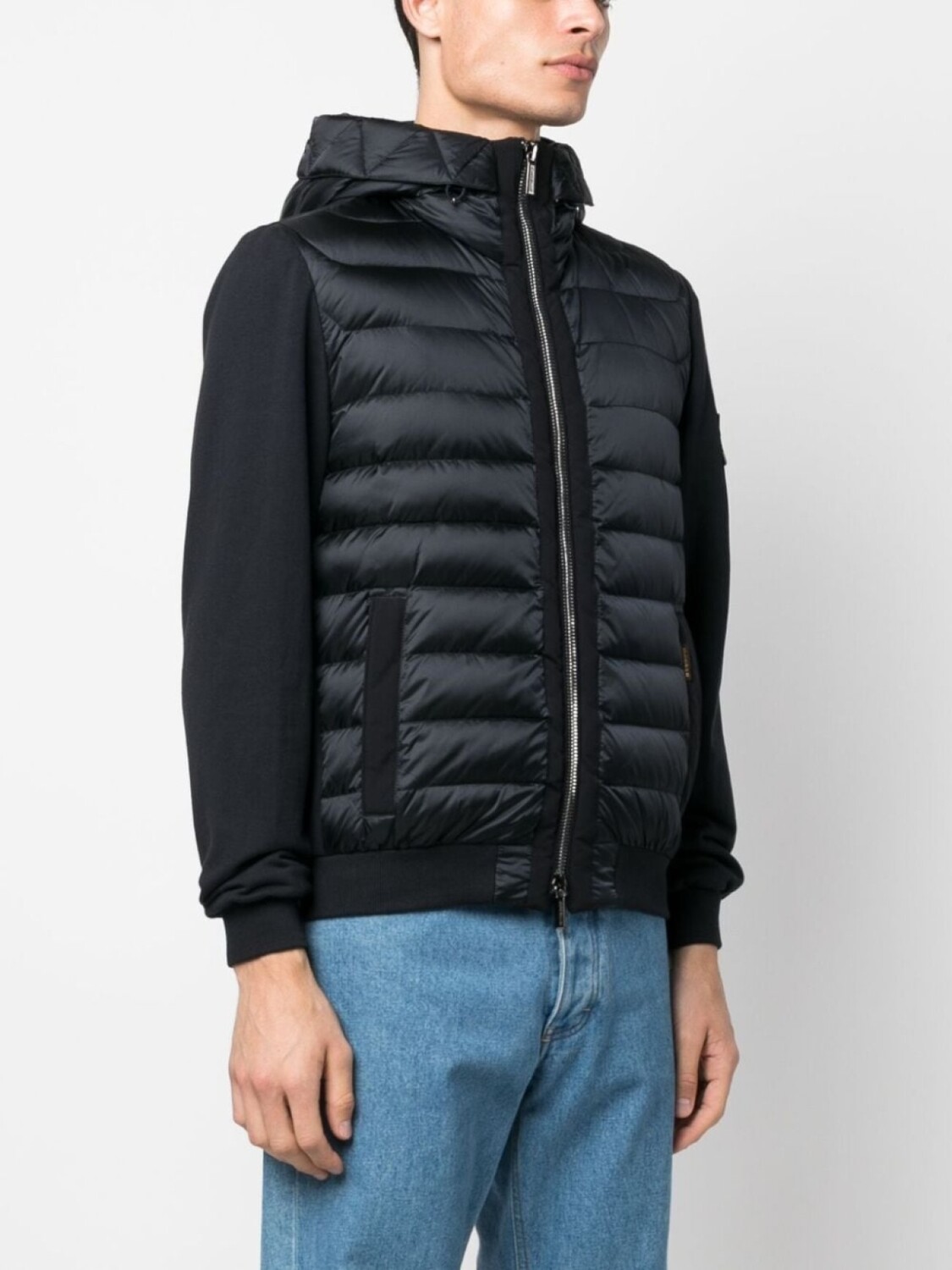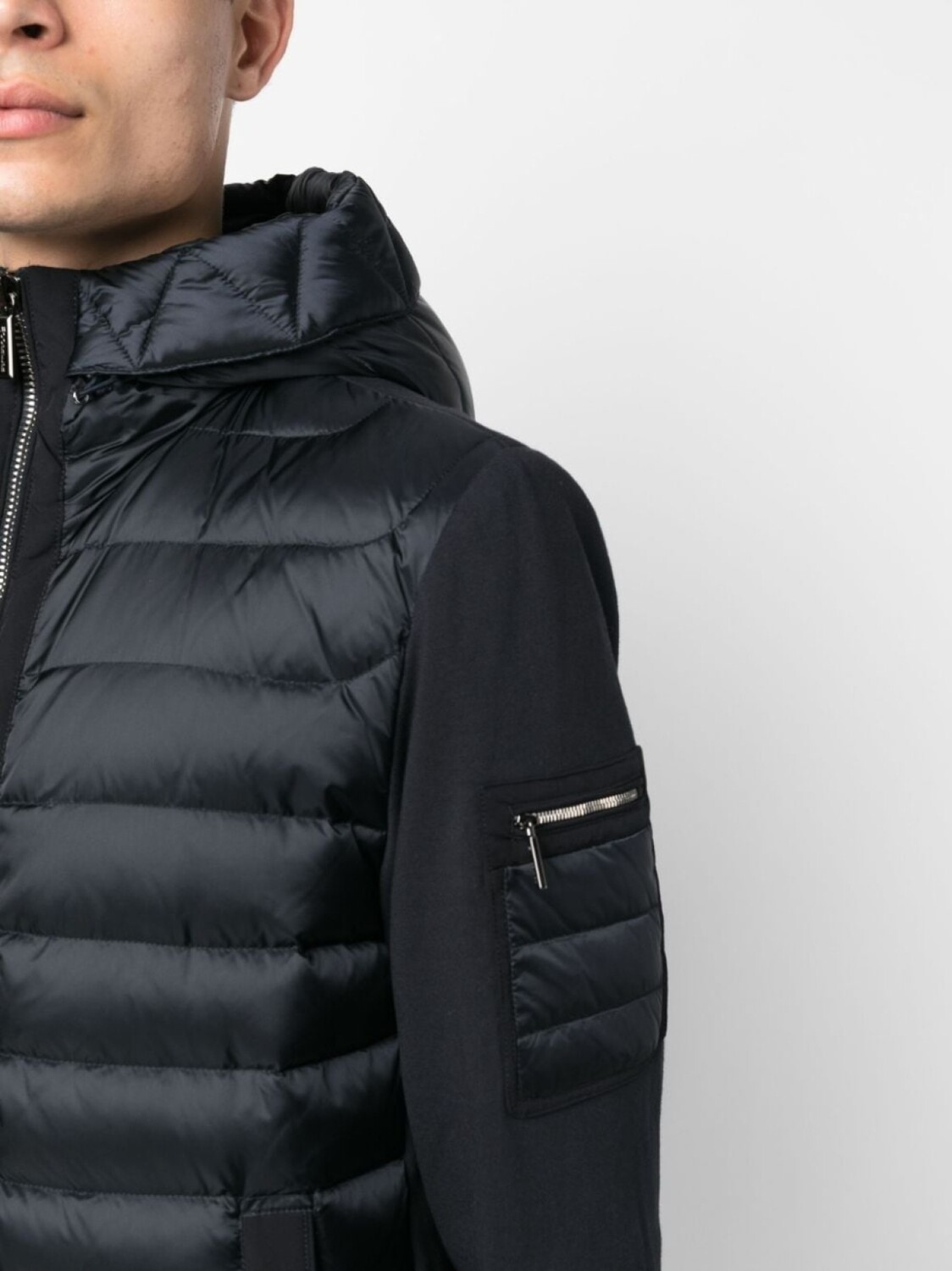 Синий, дутый материал, наполнитель из смеси пуха и пера, воротник-труба, классический капюшон, застежка на молнии спереди, два кармана на молнии по бокам, карман с молнией на рукаве, длинные рукава и контрастные рукава.