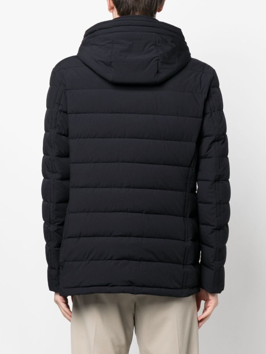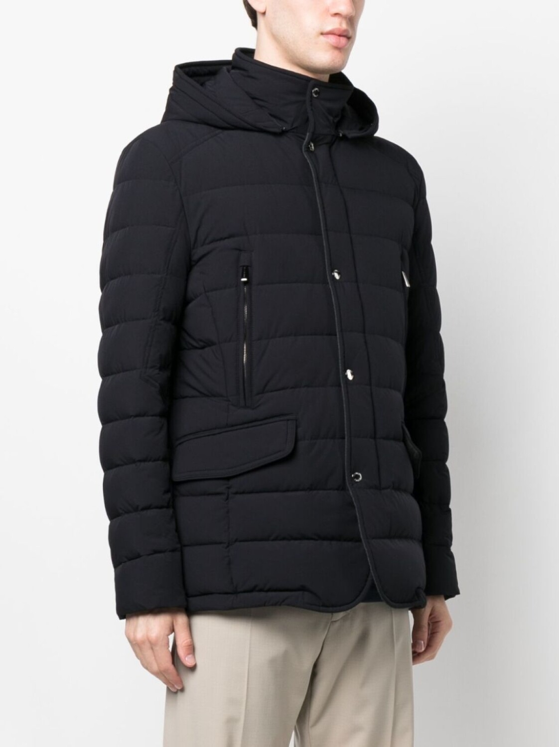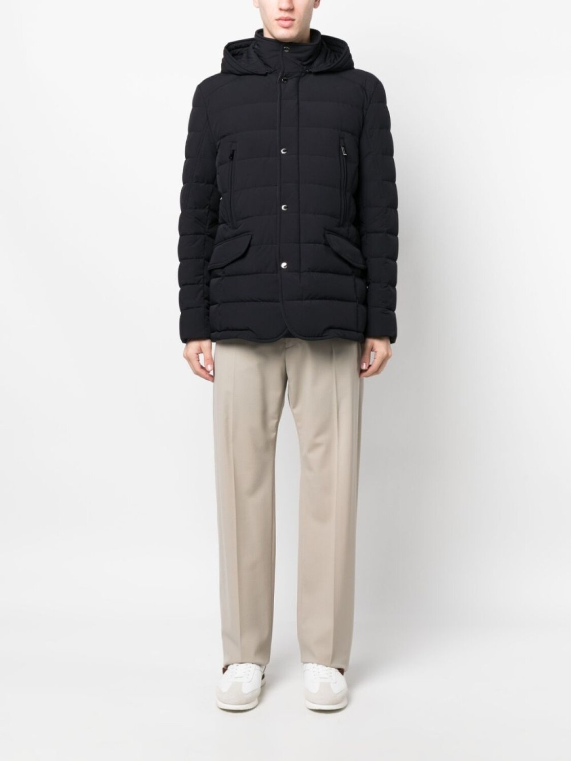 Темно-синий, смесь шерсти и кашемира, дутый материал, стеганая модель, съемный капюшон, застежка на кнопки и молнию спереди, длинные рукава, два нагрудных кармана на молнии, два передних кармана с клапанами и прямой подол.