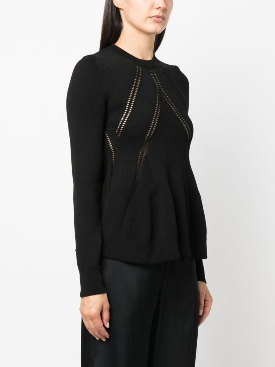 Черный, смесь шерсти и хлопка, трикотажный материал, круглый вырез, длинные рукава, баска и прямой подол.