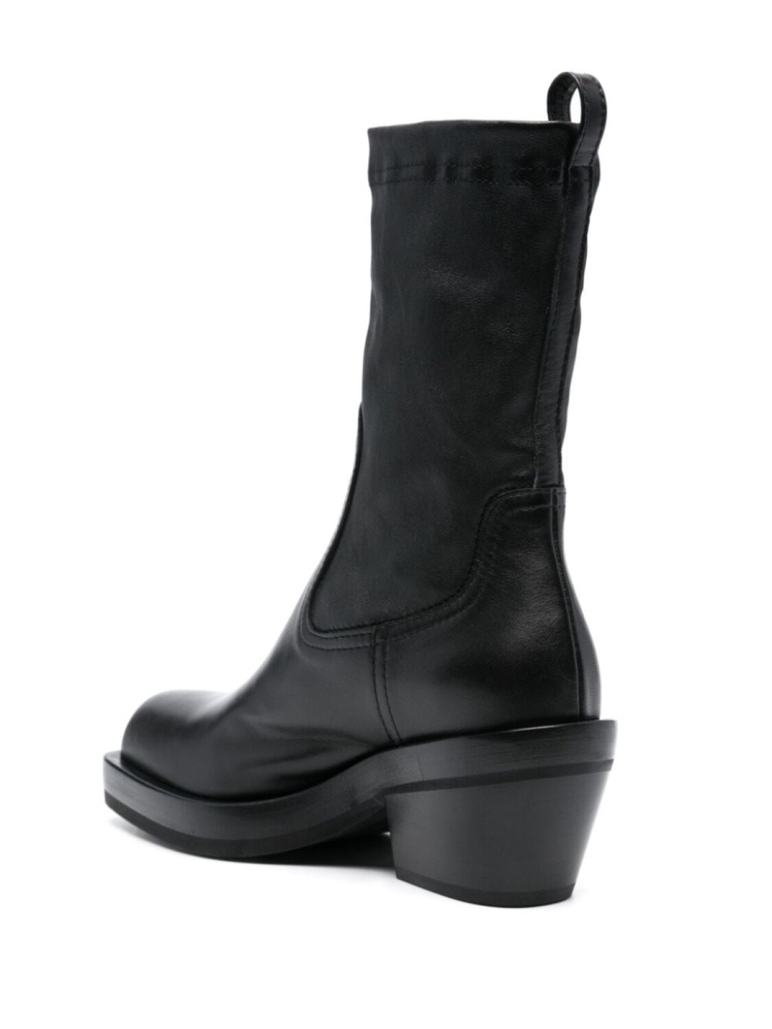 Черный, телячья кожа, глянцевое покрытие, петля для подтягивания сзади, квадратный носок, модель без застежки, кожаная стелька с логотипом, блочный каблук средней высоты и резиновая подошва.