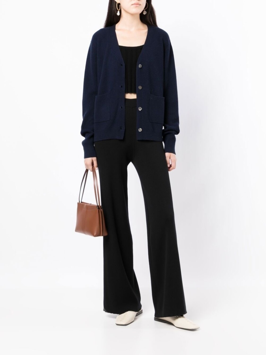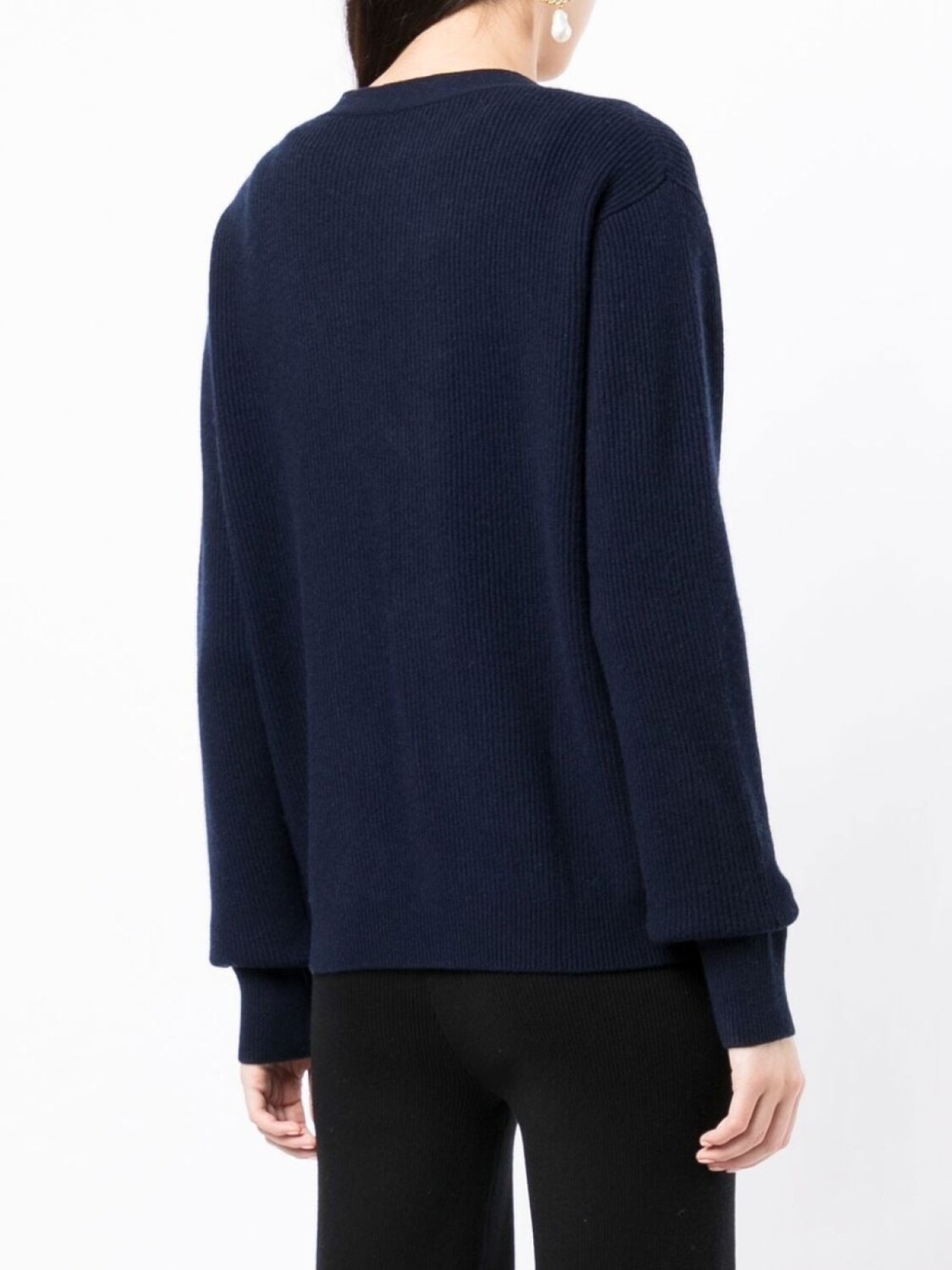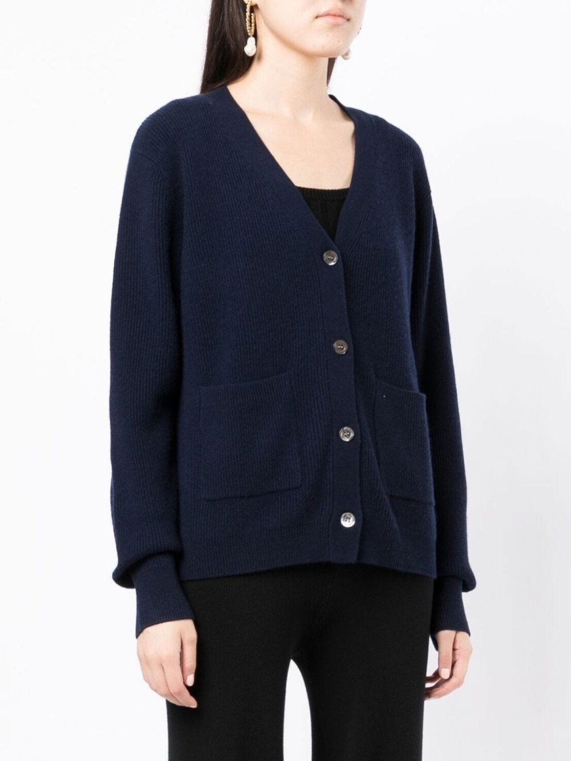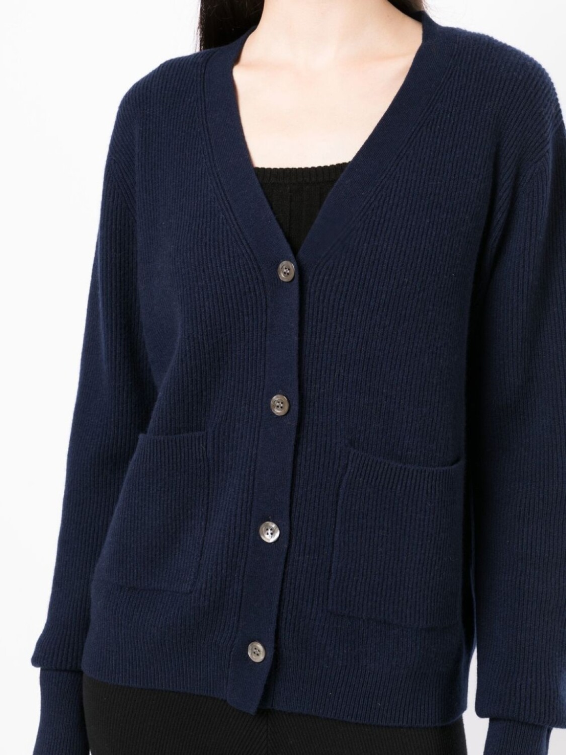 Темно-синий, смесь шерсти и кашемира, трикотаж в рубчик, V-образный вырез, длинные рукава, два накладных кармана спереди, прямой подол