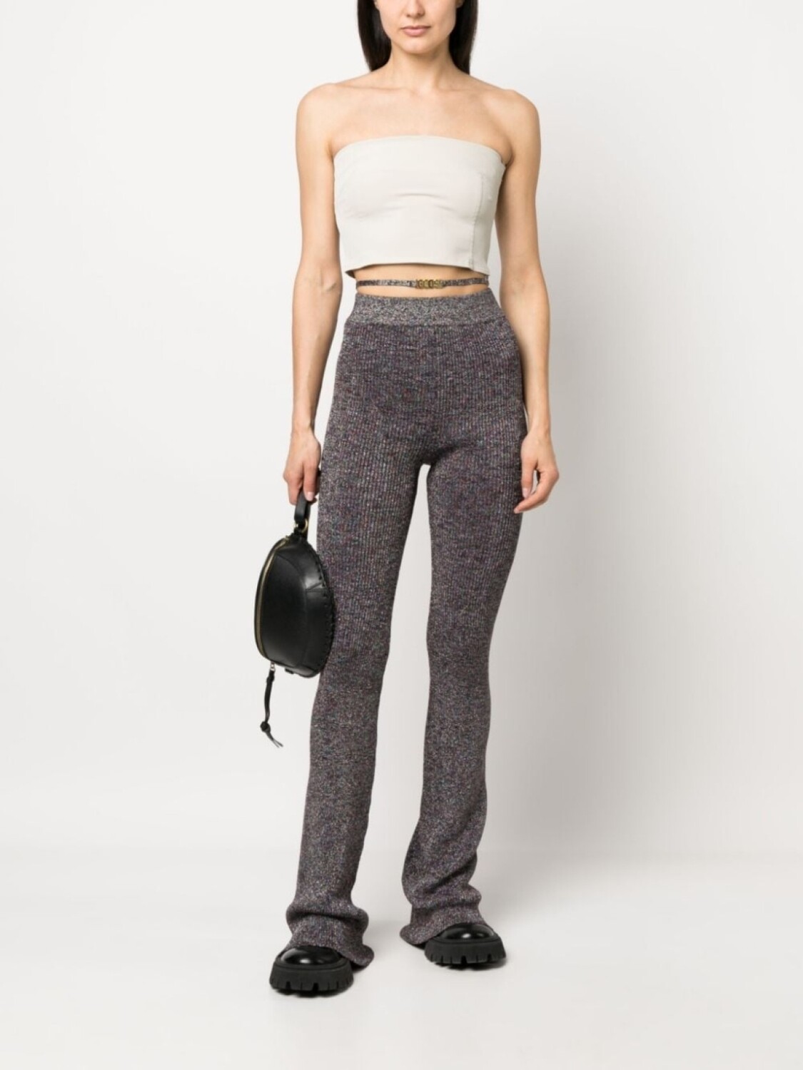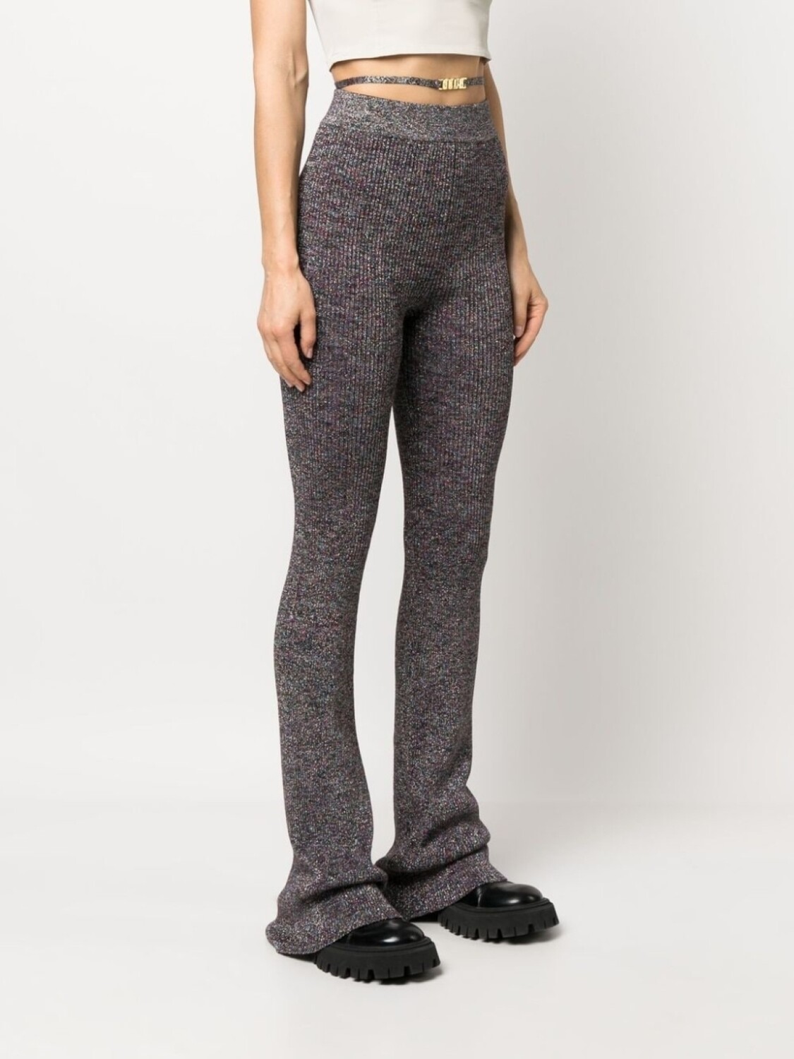 Фиолетовый, трикотаж в рубчик, эффект меланж, вставки из люрекса, золотистый логотип, расклешенный крой, завышенная талия и эластичный пояс.