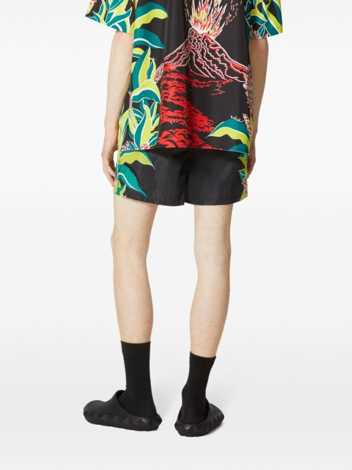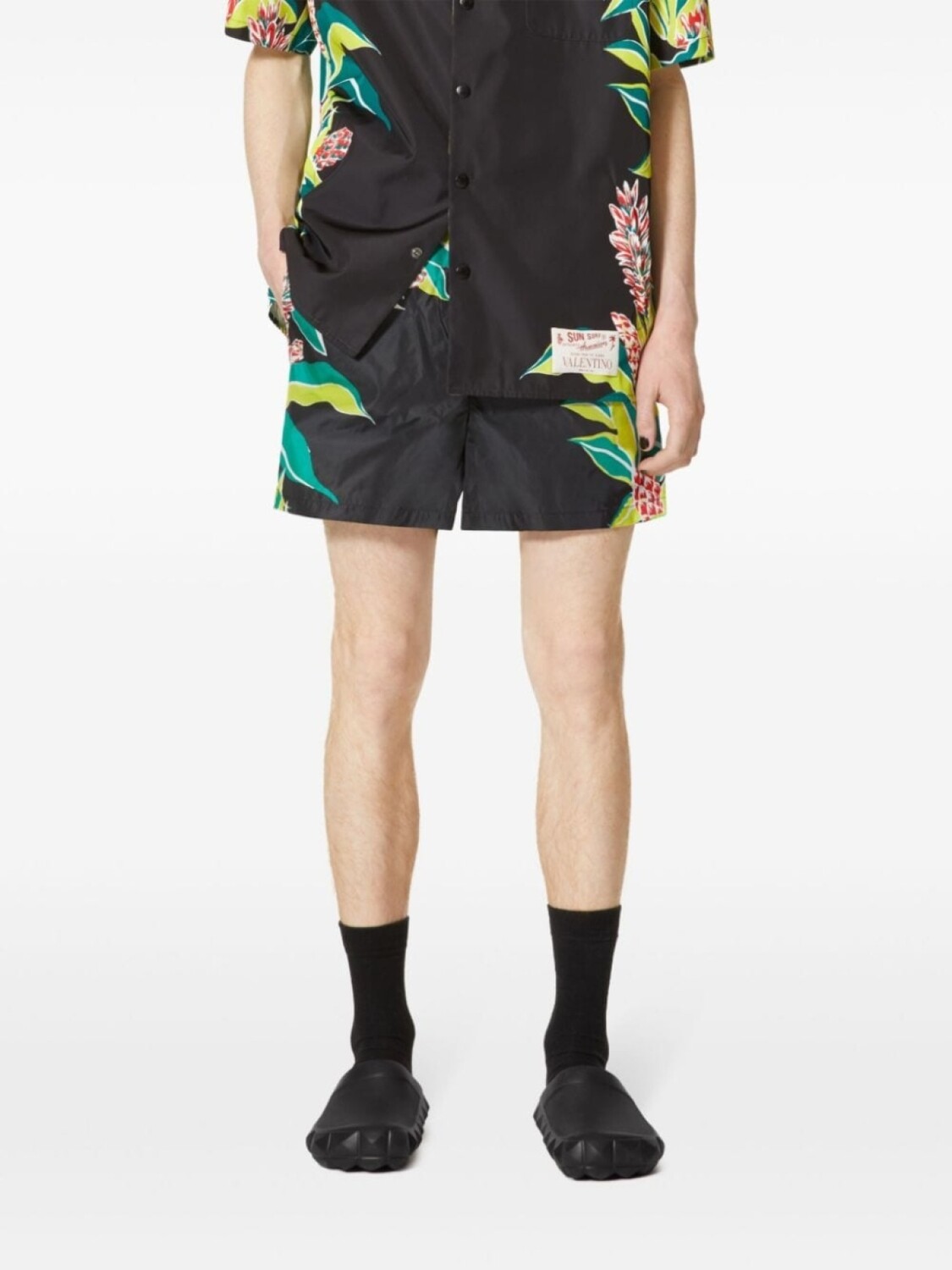 Черный/разноцветный, сплошной графичный принт, завышенная талия, эластичный пояс, два кармана по бокам, Пожалуйста, примеряйте купальники и пляжные шорты только поверх собственного белья., Образ включает аксессуары Valentino Garavani., Коллекция Valentino Ready To Wear.