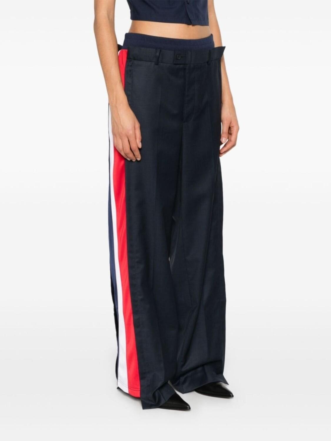 Подробнее о товаре: • темно-синий • смесовая шерсть • многослойный дизайн • полоски сбоку • петли для ремня • декоративная ширинка спереди • стрелки • строгий крой • два прорезных кармана по бокам • два прорезных кармана на пуговицах сзади • эластичный пояс на шнурке • Этот товар изготовлен из переработанных или повторно использованных материалов, поэтому его внешний вид может незначительно отличаться от фотографий.