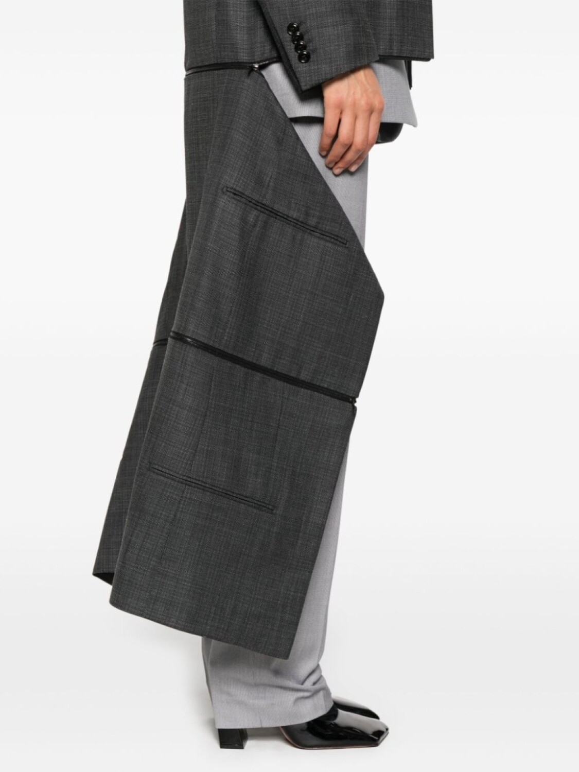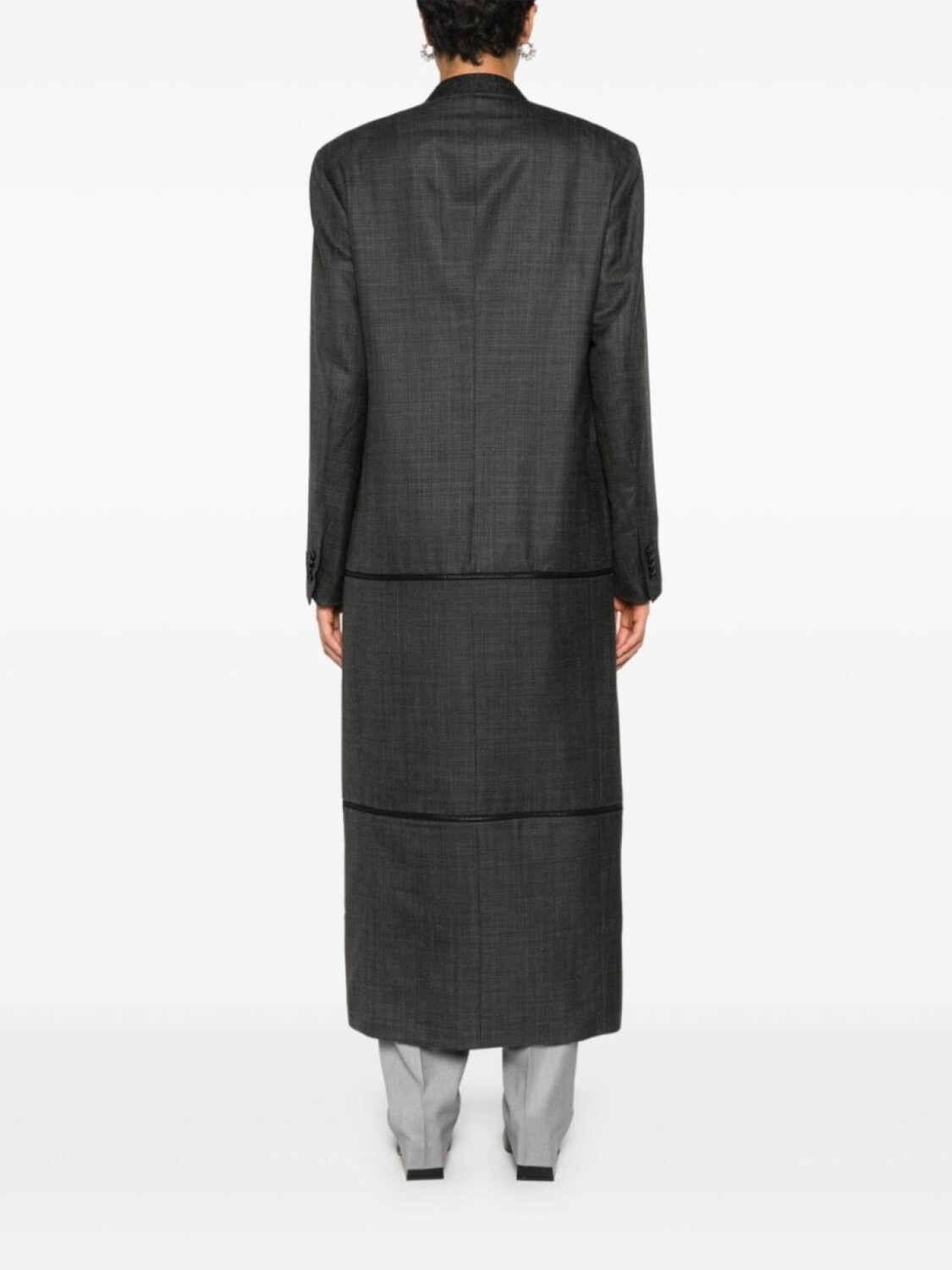Серый, смесовая шерсть, переплетенный дизайн, без воротника, V-образный вырез, подплечники, длинные рукава с манжетами на пуговицах, логотип на рукаве, прорезной карман на груди, защипы, два прорезных кармана спереди, регулируемая длина, внутренние прорезные карманы, цельная подкладка, модель без застежки
