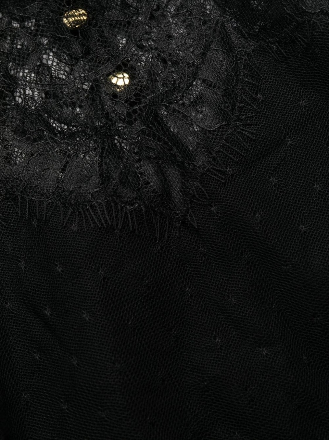 Черный, сетчатая ткань в горошек, вставки из цветочного кружева, открытая спина, круглый вырез, длинные рукава, застежка на пуговицы сзади и неравномерный подол.