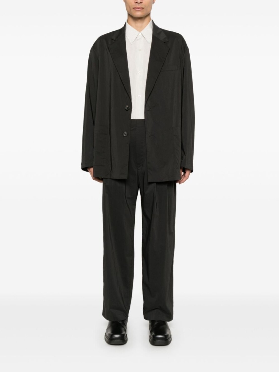 Антрацитово-серый, легкая конструкция, складки, застежка на молнии спереди, эластичный пояс сзади, петли для ремня, два диагональных кармана по бокам, стрелки, два кармана с листочкой сзади, прямой крой