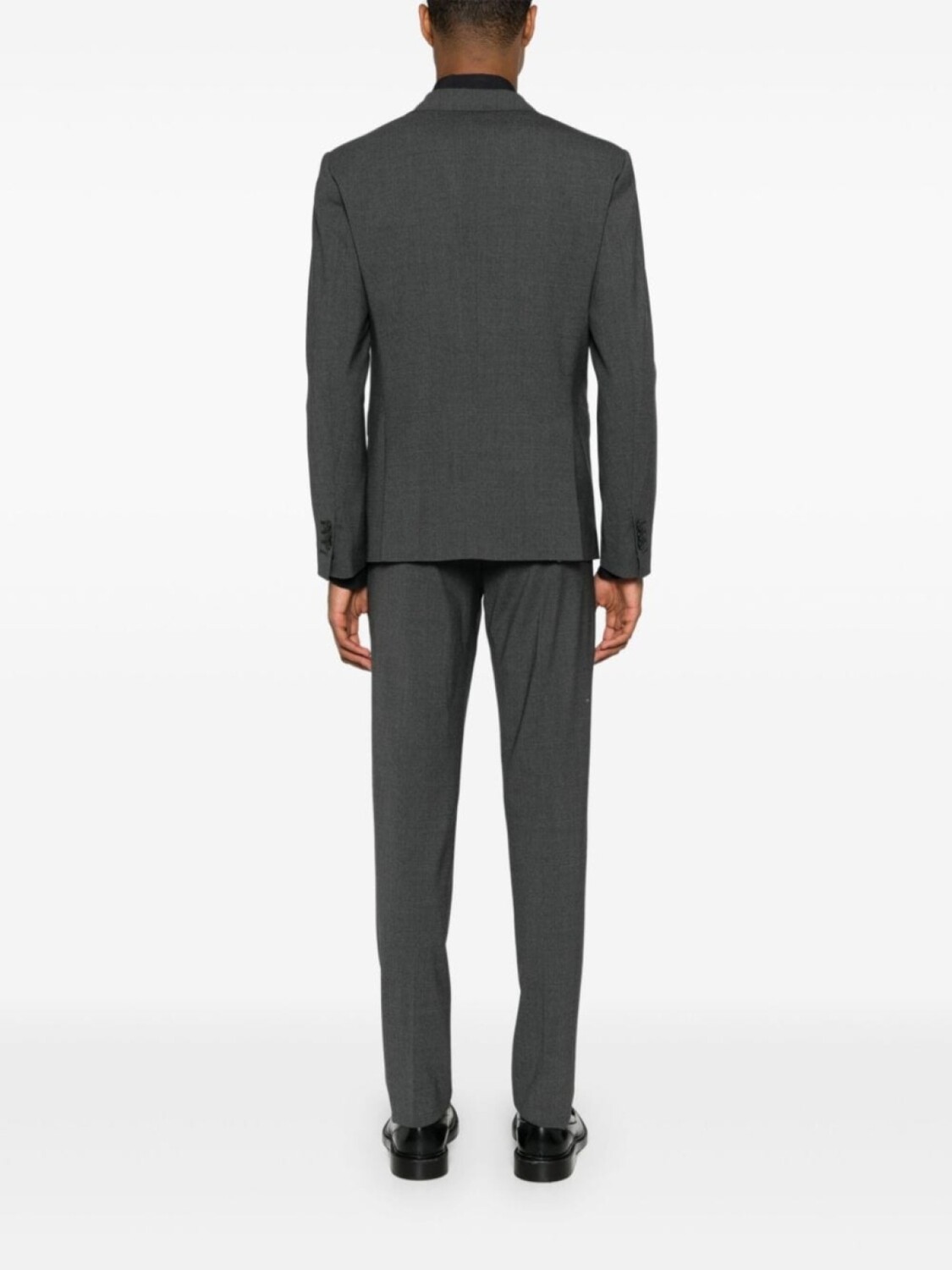 Темно-серый, из смеси натуральной шерсти, индивидуальный пошив Пиджак: заостренные лацканы, застежка на пуговицы спереди, подплечники, длинные рукава, манжеты на пуговицах, нагрудный прорезной карман, два передних кармана с клапанами, шлицы сзади в английском стиле, прямой подол Брюки: потайная застежка на пуговицы, крючок и молния спереди, узкий покрой, два боковых врезных кармана, два задних прорезных кармана на пуговицах, прямой подол