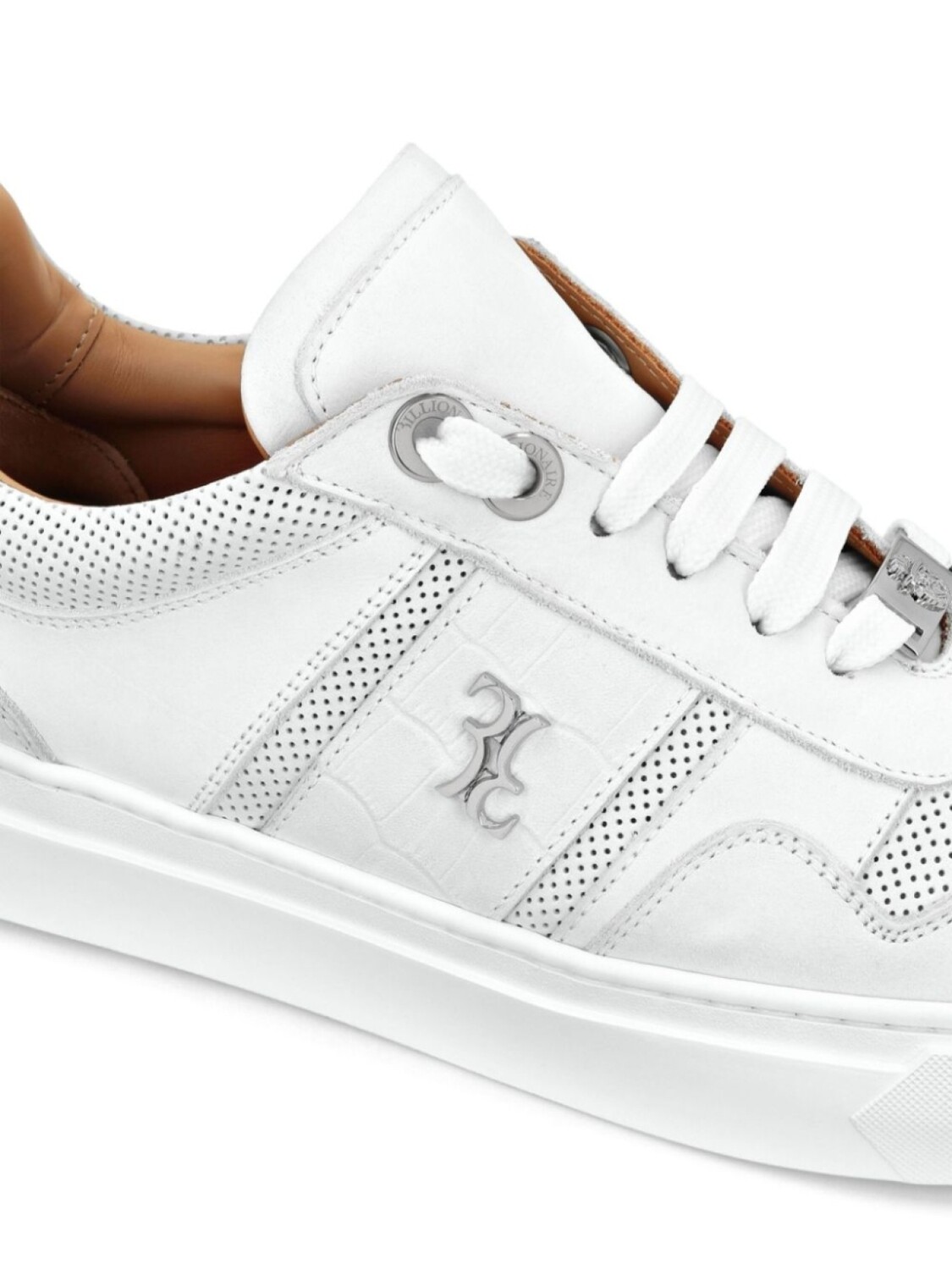 Белая телячья кожа с тиснением под крокодила, серебристая пластинка с логотипом, сетчатые вставки, шнуровка спереди, круглый носок, плоская резиновая подошва