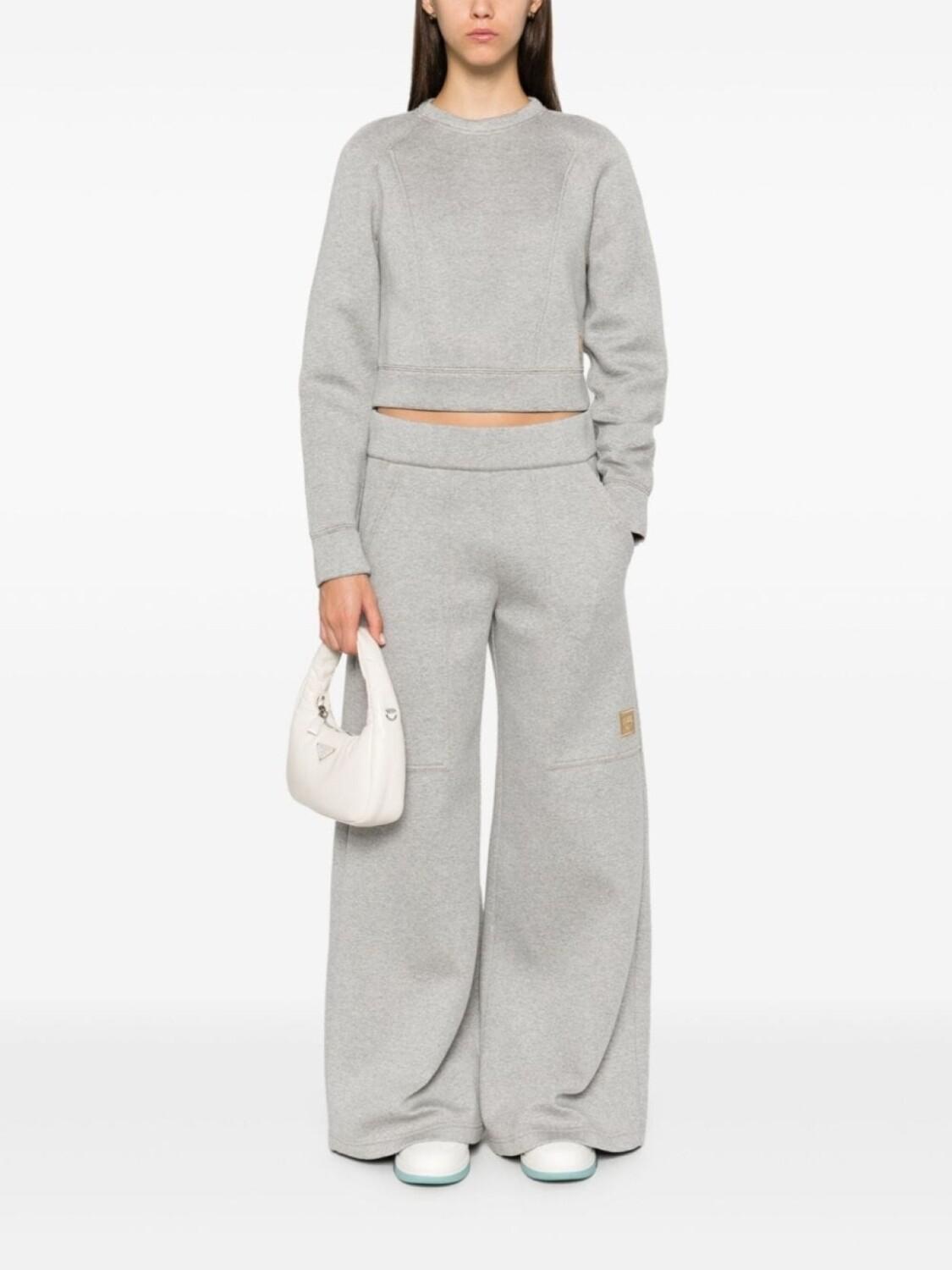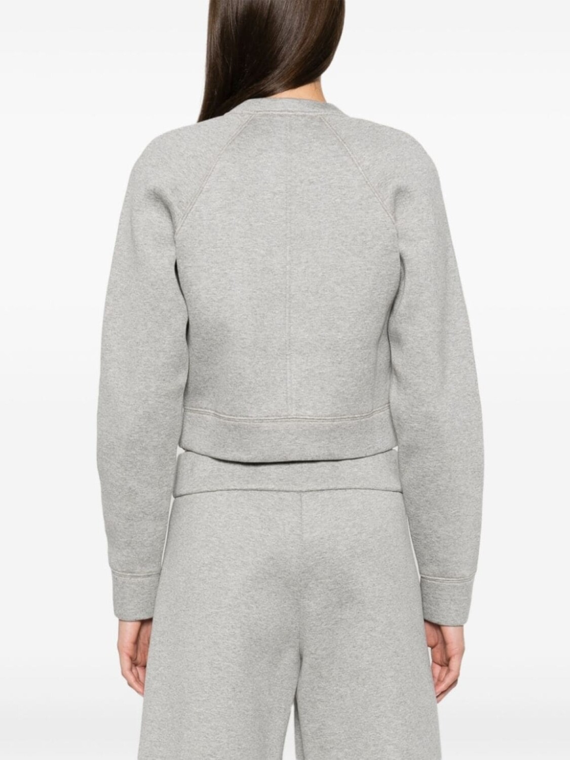 Меланжевый серый эффект, мягкий трикотаж с эффектом скуба, круглый вырез горловины, отделка швом, длинные рукава реглан, логотип сбоку, прямой укороченный подол
