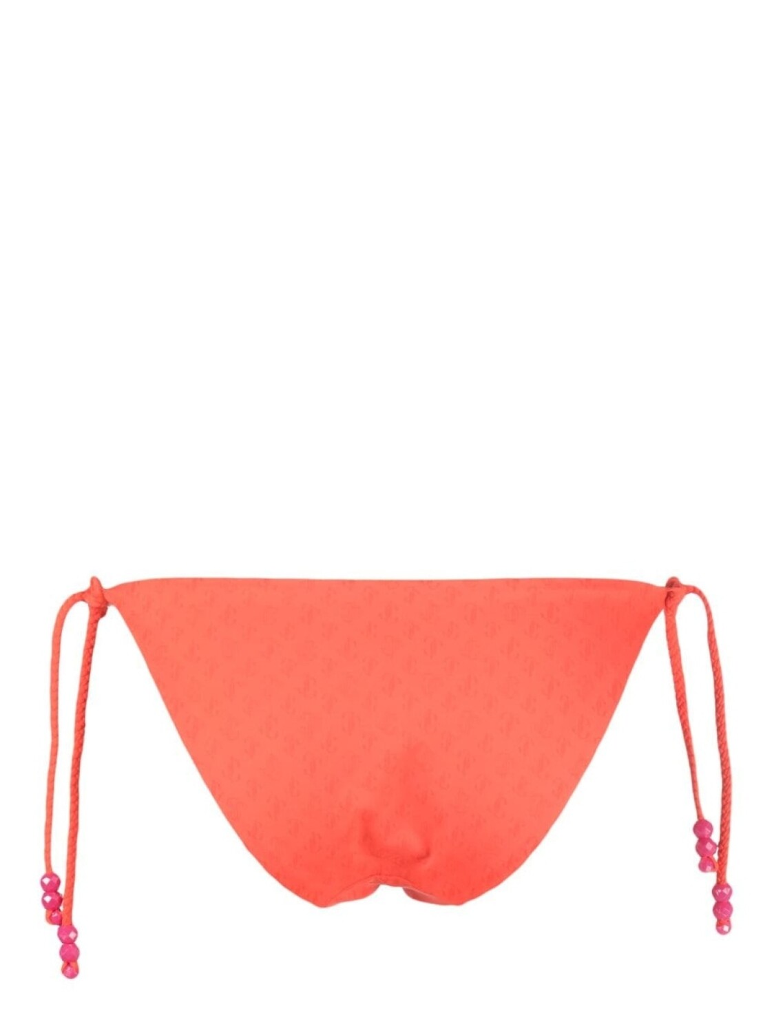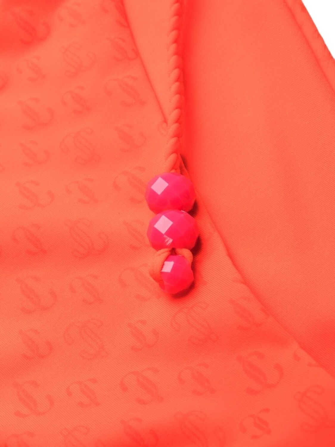 Тыквенно-оранжевый, фуксия, эластичный материал, сплошной принт с тисненым логотипом, декор из бисера и завязки по бокам. Пожалуйста, примеряйте купальники и пляжные шорты только поверх собственного белья.