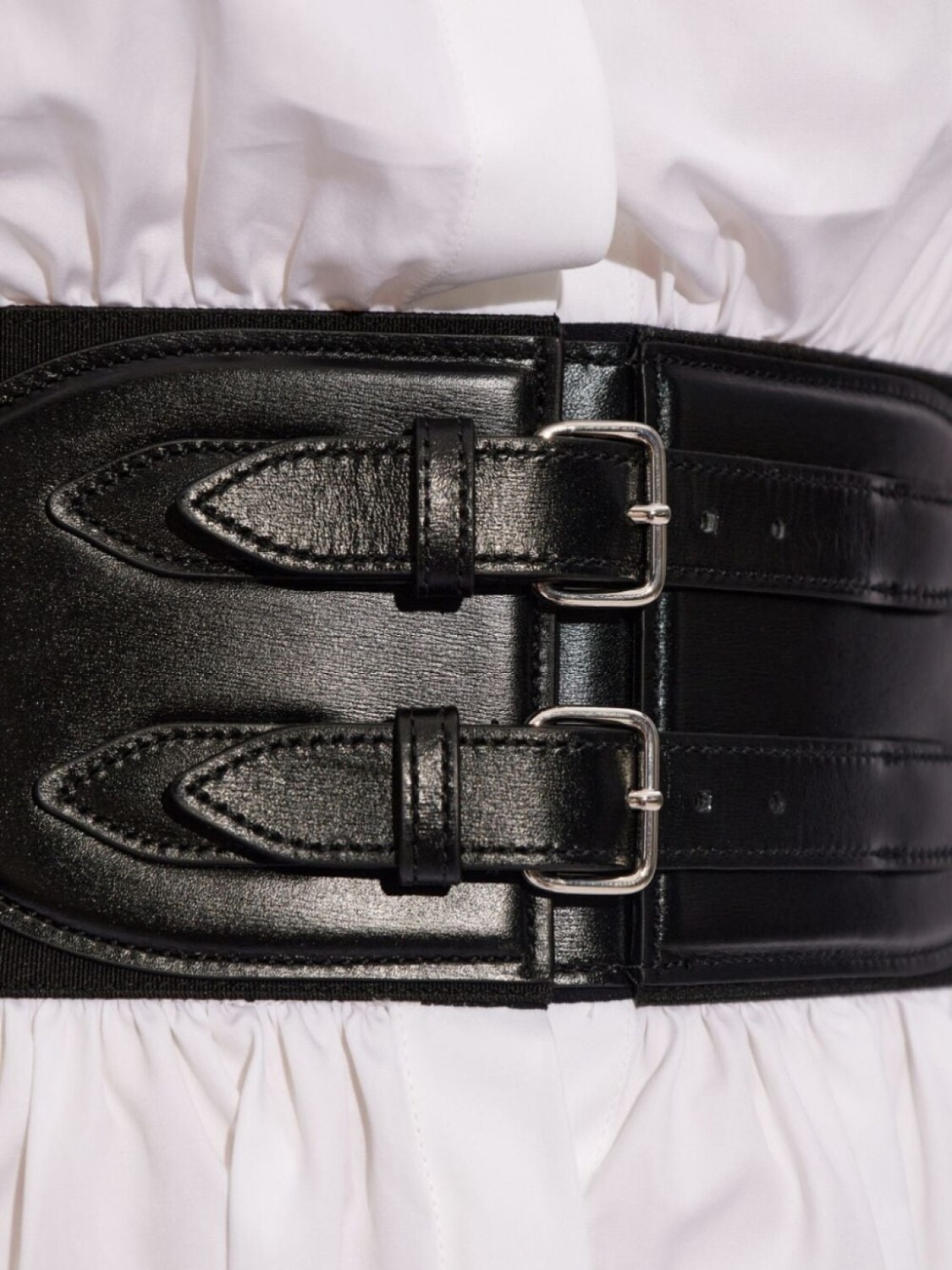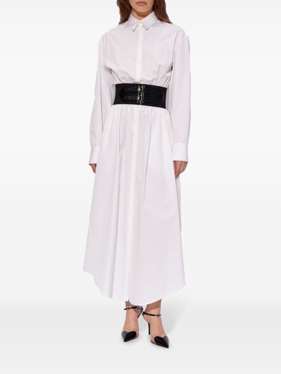 Белый хлопковый поплин текстура классический воротник длинные рукава манжеты на пуговицах пояс на талии потайная застежка на пуговицы спереди закругленный подол