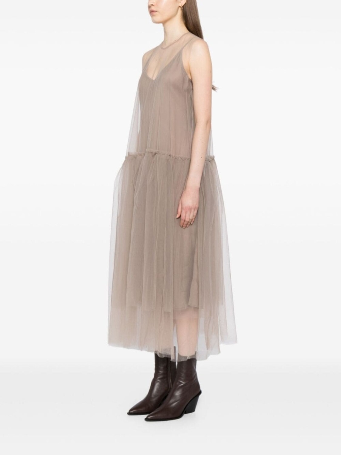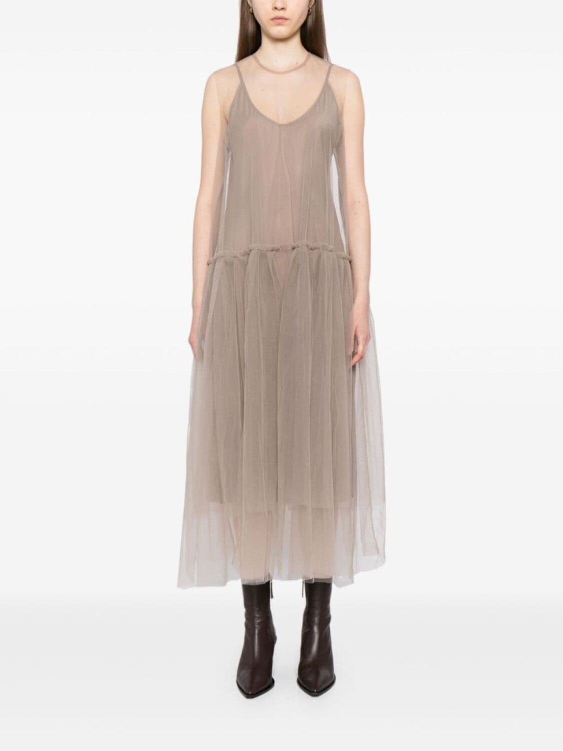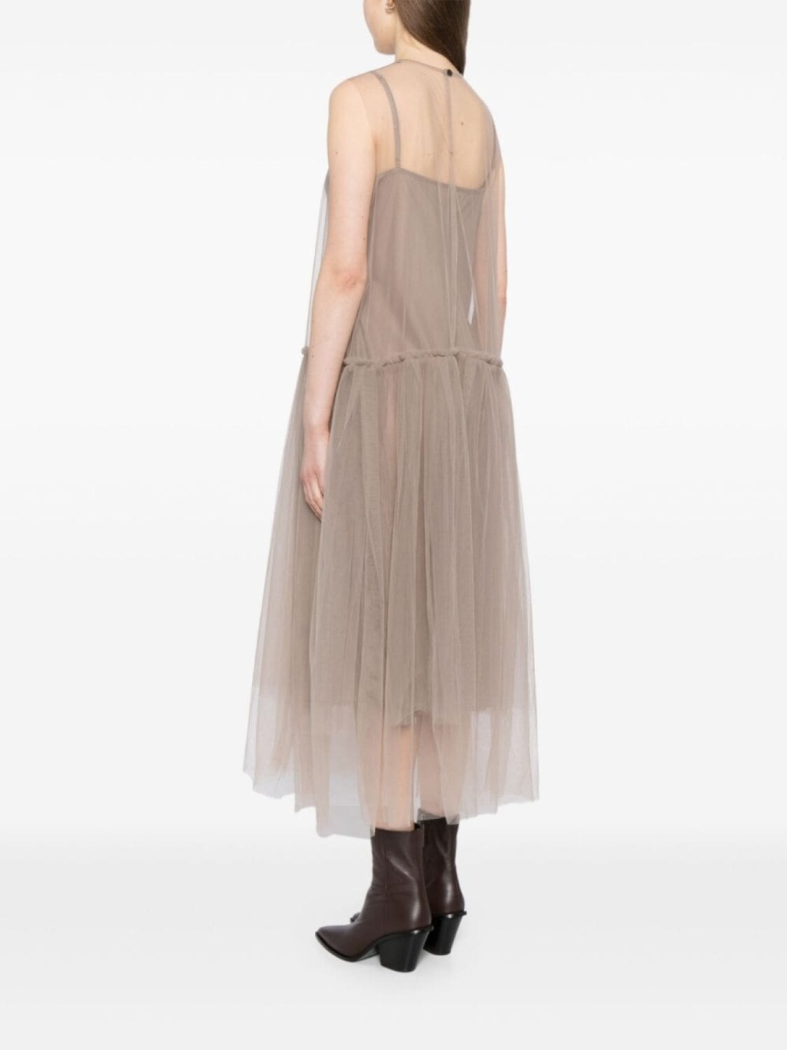 Серый хаки, верхний слой из тюля, круглый вырез, без рукавов, заниженная талия, расклешенная юбка, средней длины, воротник на пуговицах сзади, регулируемые лямки, внутреннее платье-комбинация, прямой подол