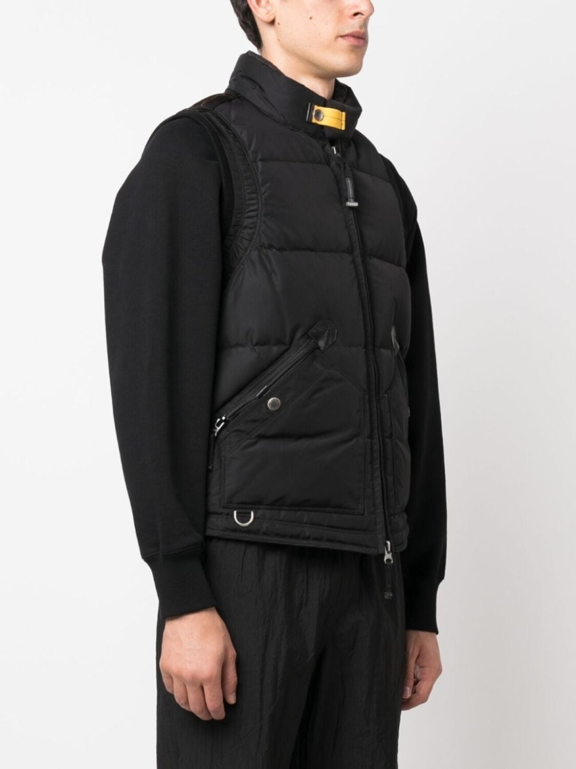 Черный, наполнитель из пуха и перьев, дутый материал, нашивка с логотипом сзади, высокий воротник, без рукавов, двусторонняя молния спереди, два кармана на молнии по бокам и прямой подол.