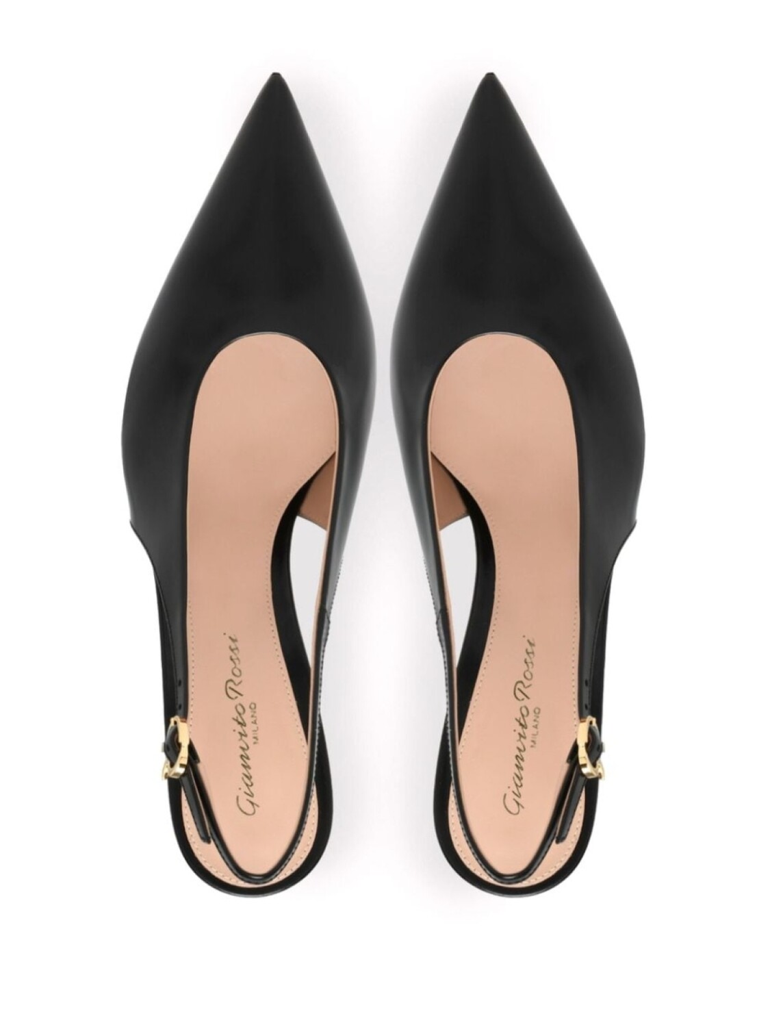 Черный, телячья кожа, ремешок на пятке с пряжкой, стелька с логотипом, заостренный носок, каблук на высокой шпильке