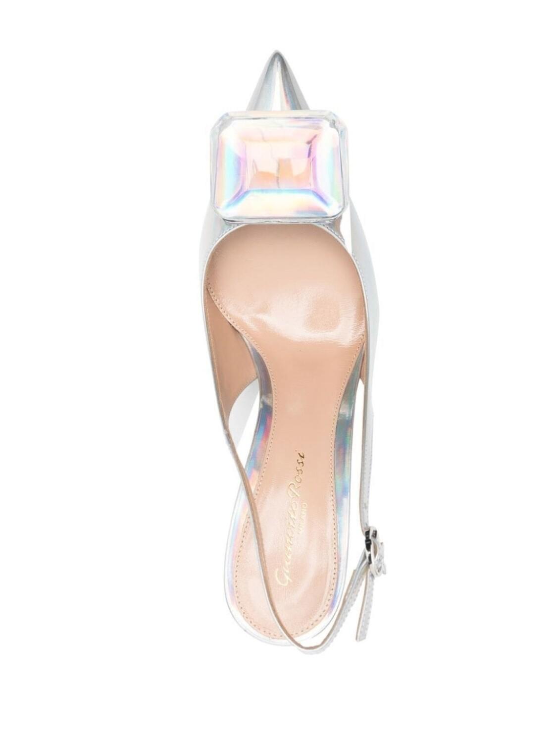 Серебристый, телячья кожа, покрытие с эффектом металлик, декор из кристаллов, заостренный носок, модель без застежки, ремешок на пятке с пряжкой и каблук на высокой шпильке.
