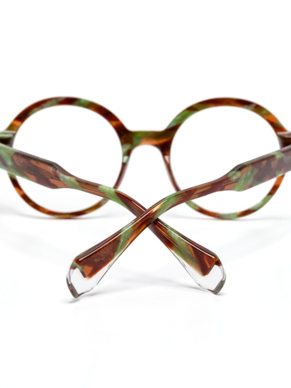 Коричневый/зеленый, ацетат, мраморный узор, круглая оправа, прозрачные линзы, скульптурные дужки, дужки с закругленными концами, В комплект входит защитный чехол для очков., Обратите внимание, что на FARFETCH продаются оправы с линзами без диоптрий.