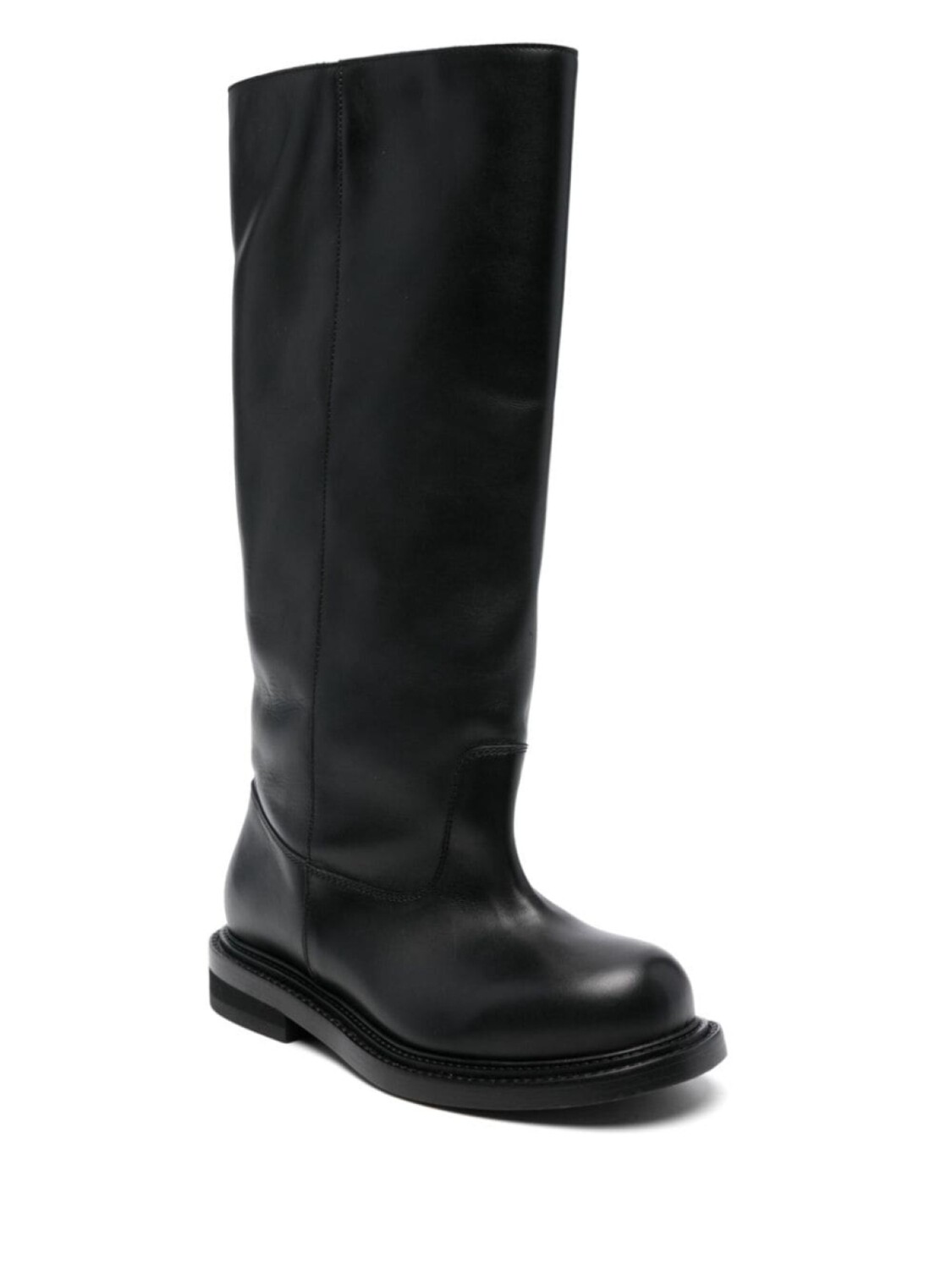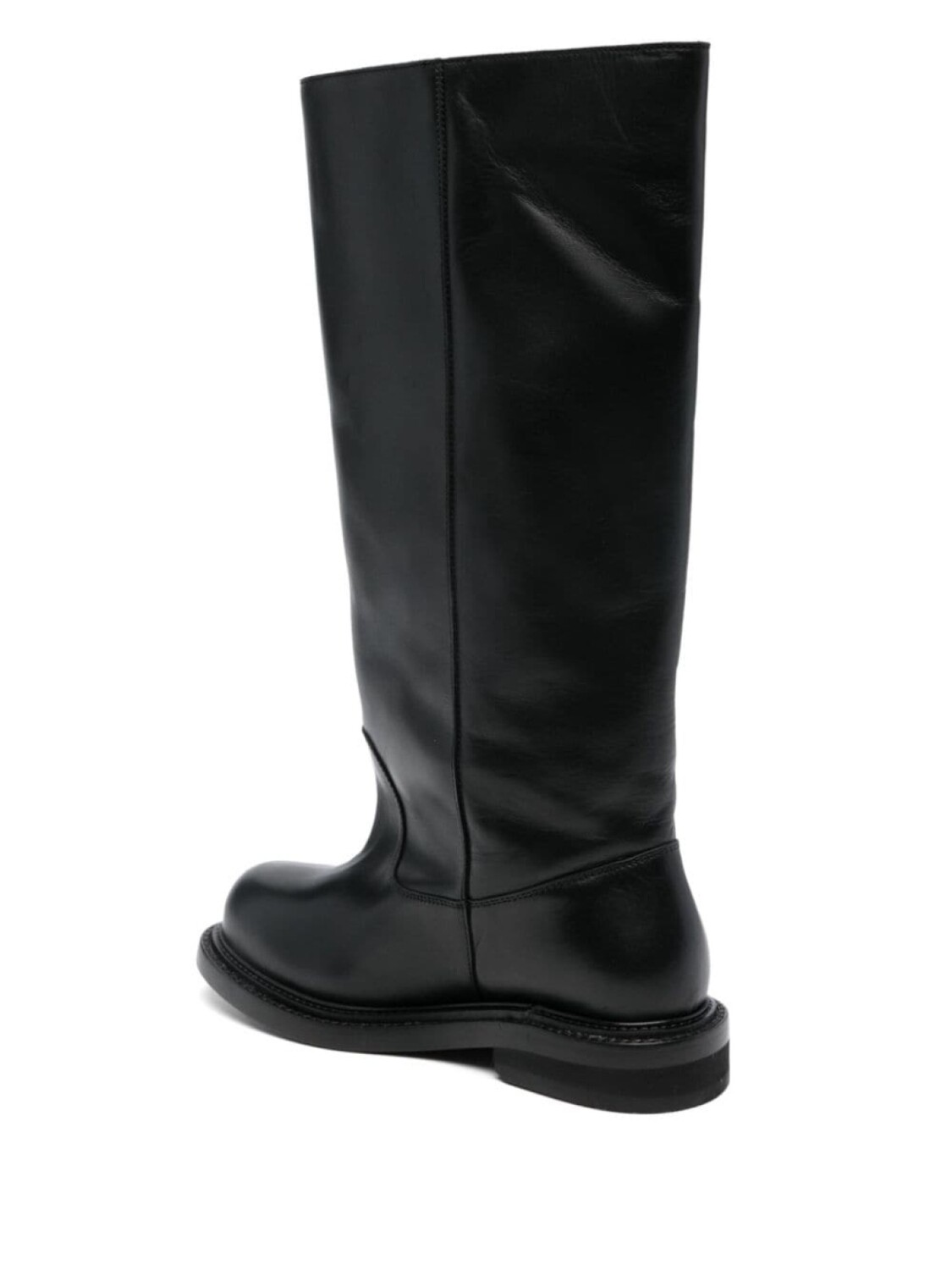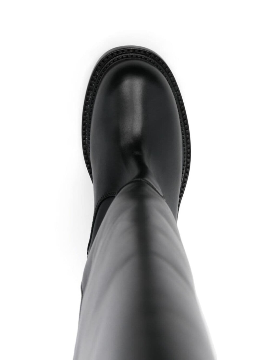 Туфли из черной телячьей кожи с гладким зерном, закругленный носок, фирменная стелька, резиновая подошва, длина до середины икры. Изделие поставляется в комплекте с защитным мешком для защиты от пыли.