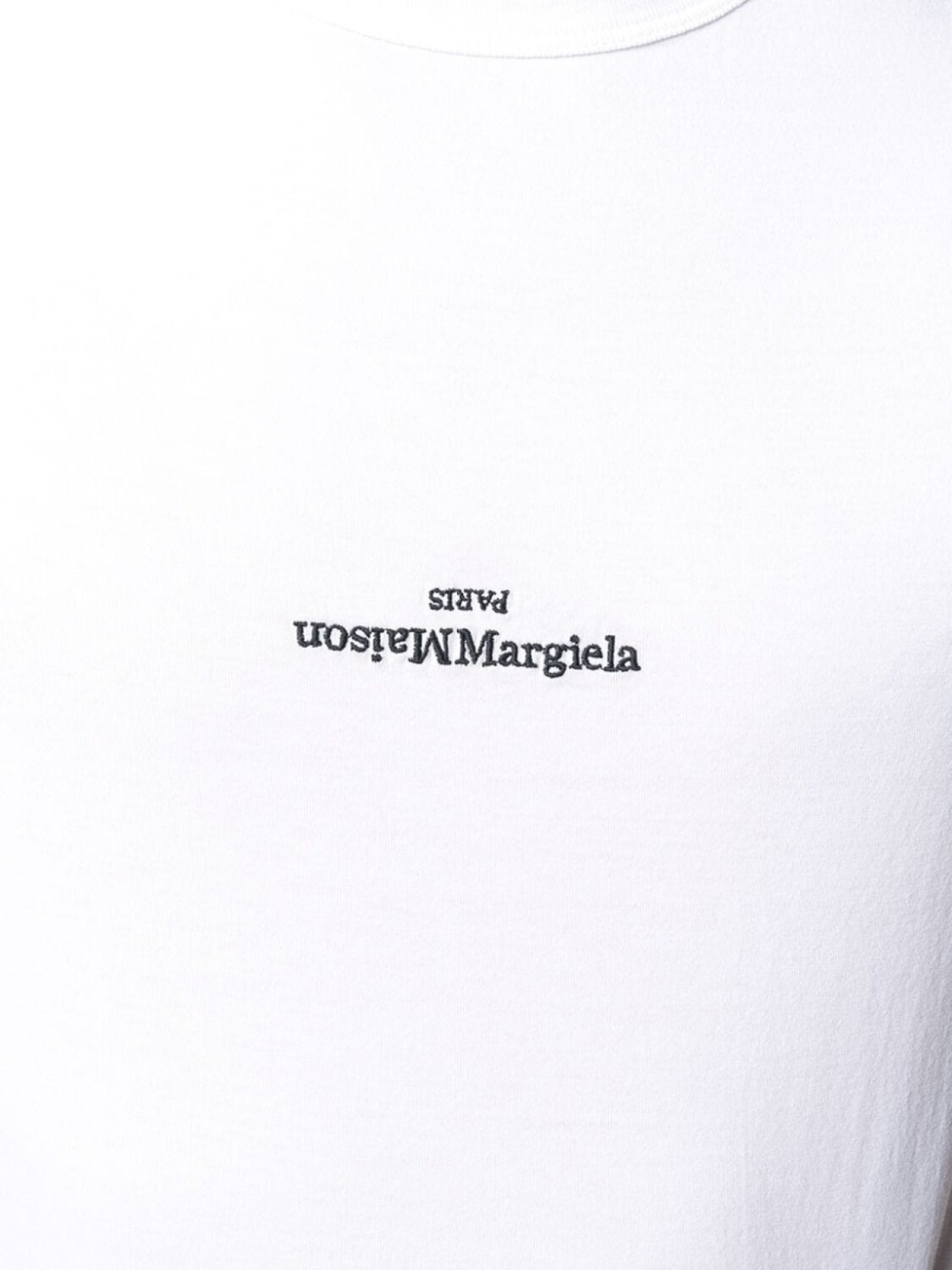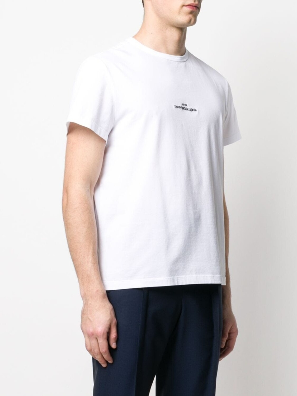 Футболка с вышитым логотипом от Maison Margiela. Круглый вырез, вышитый логотип спереди, короткие рукава, прямой подол и свободный крой. Цвет: белый.