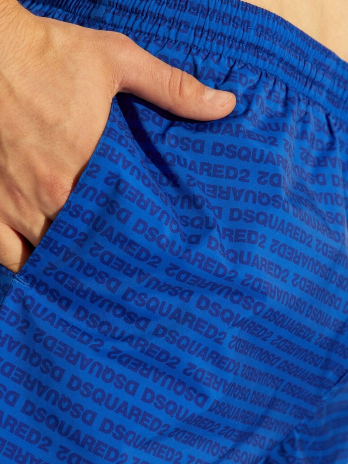 Цвет королевского синего цвета, сплошной принт с логотипом, эластичный пояс на шнурке, два прорезных кармана по бокам, длина до бедер. Обязательно примеряйте купальники поверх своей одежды.