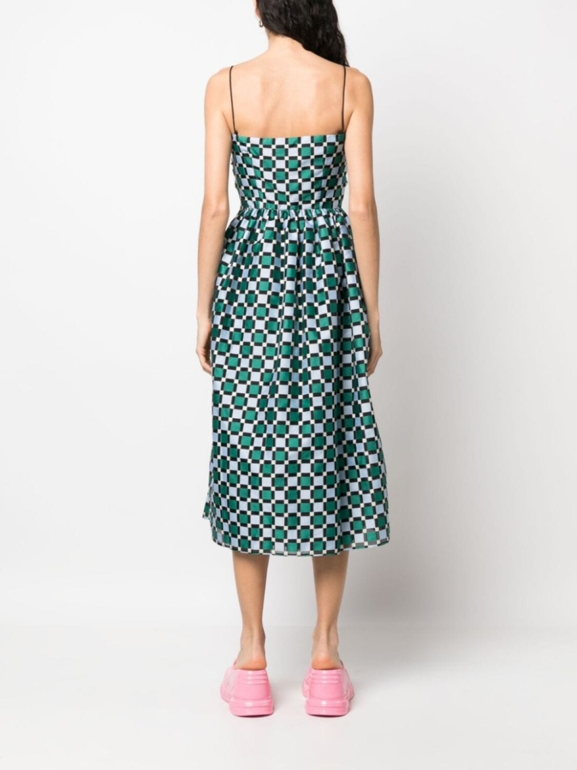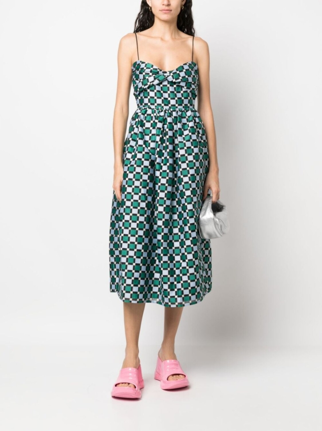 Подробнее о товаре: Разноцветный, смесовый переработанный полиамид, клетчатый узор, люрекс, тонкие бретели, вырез в форме сердца, перекрученная деталь, два прорезных кармана по бокам, пышная юбка и длина миди. Этот товар как минимум на 50% состоит из переработанных или повторно использованных материалов. Узнать больше о том, какие товары получают отметку «Ответственный выбор», можно из материала «Как мы оцениваем экологичность и этичность».