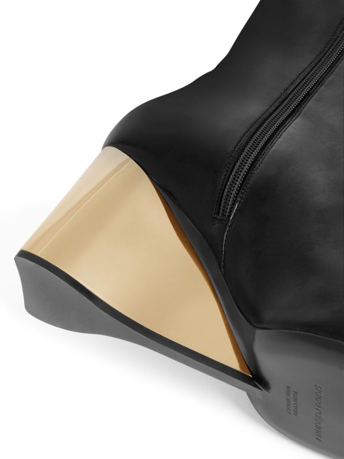 Черный, телячья кожа, длина ниже колена, застежка на молнии сбоку, миндалевидный носок и высокая танкетка.