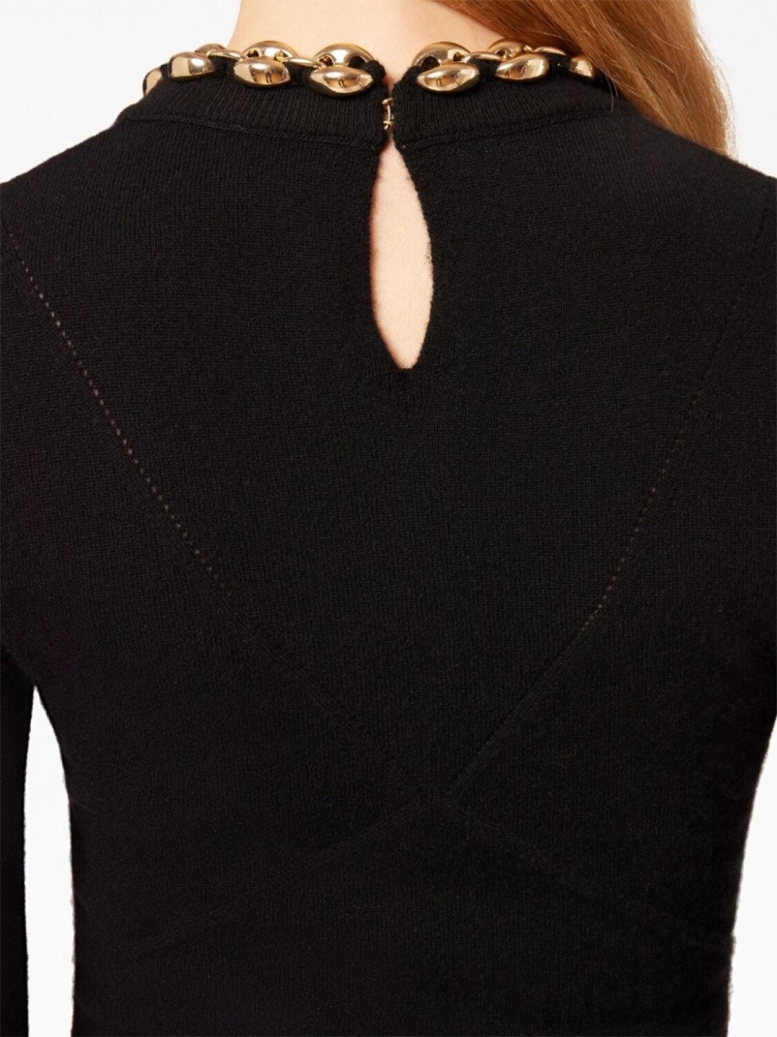 Черный, смесь шерсти и кашемира, трикотажный материал, трикотаж в рубчик, цепочка на шею, укороченная длина и длинные рукава.