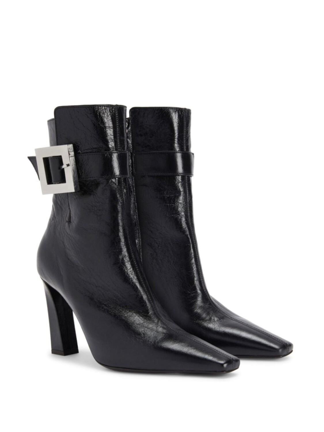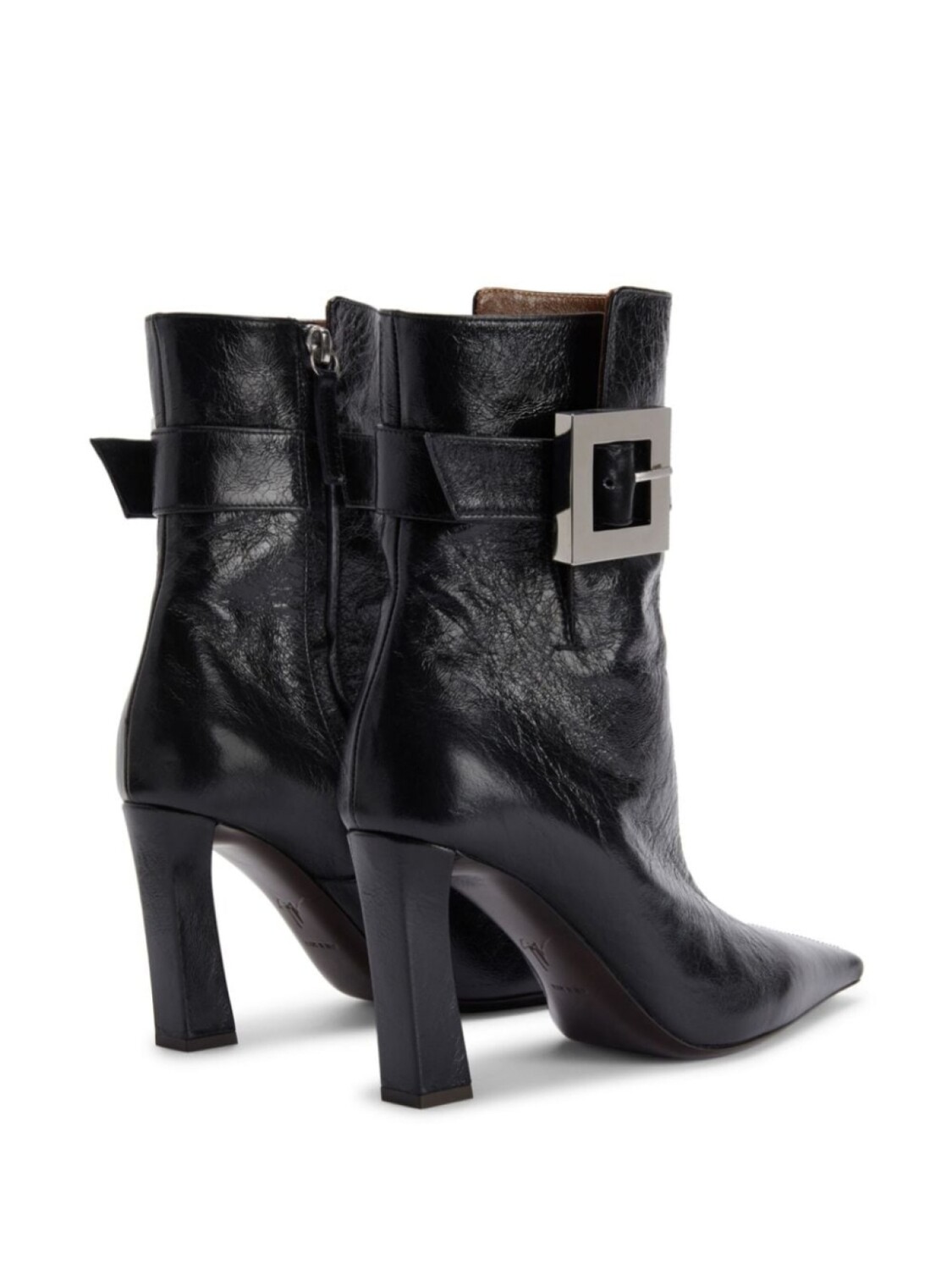 Черный, кожа, декоративная пряжка, заостренный носок, застежка на молнии сбоку, высота по щиколотку, высокий блочный каблук
